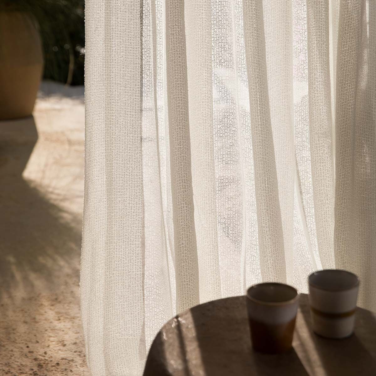 Například kolekce Atlas od Lizzo nabízí elegantní, měkce splývavé závěsové látky, které jsou vhodné i pro exteriér. Právě závěsy a záclony na terasu nebo balkon se stávají silným trendem – přinášejí soukromí, stín a zároveň dotvářejí vizuální rám pro celý prostor.