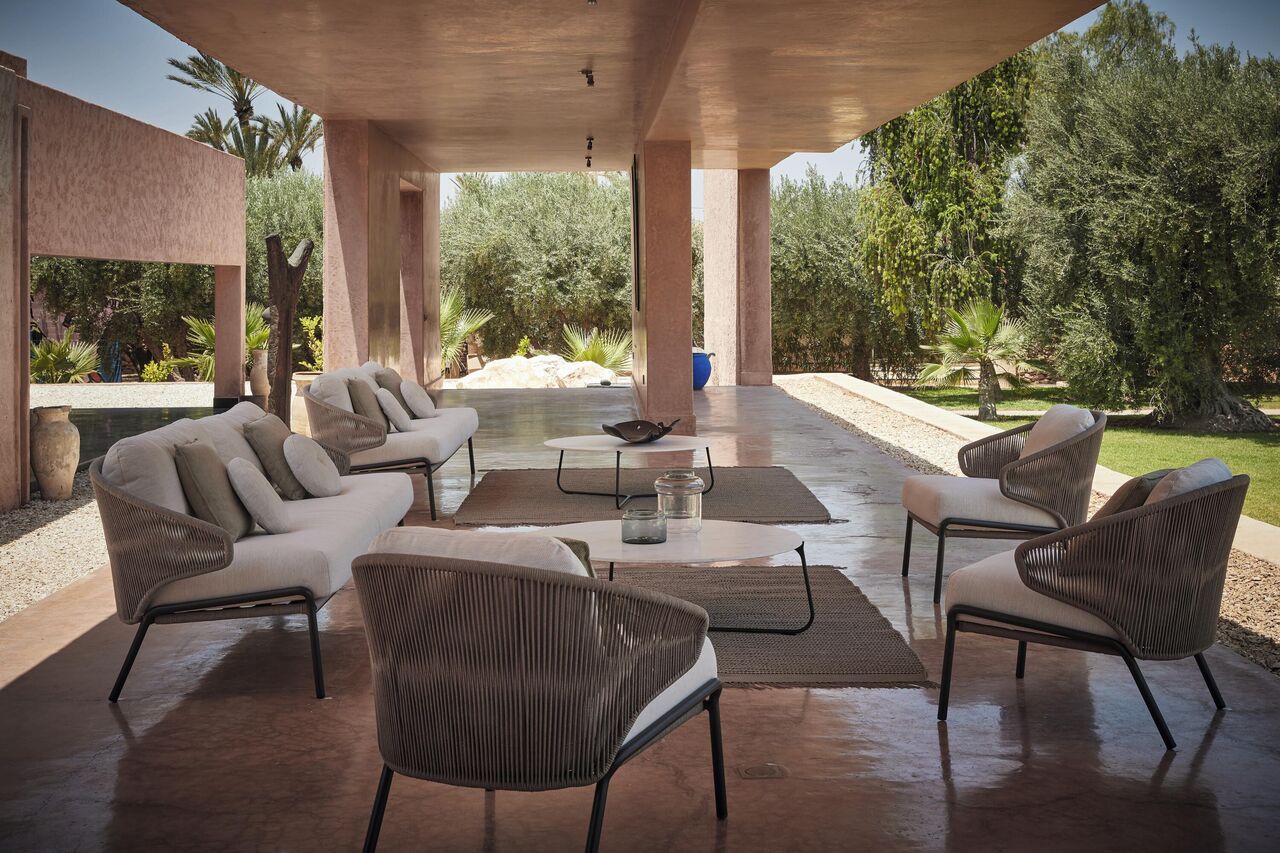 - Venkovní koberce Manutti – odolné proti vlhkosti, UV záření a zároveň příjemné na dotek. Spojí terasu s interiérem nebo pomohou vymezit odpočinkovou zónu.
