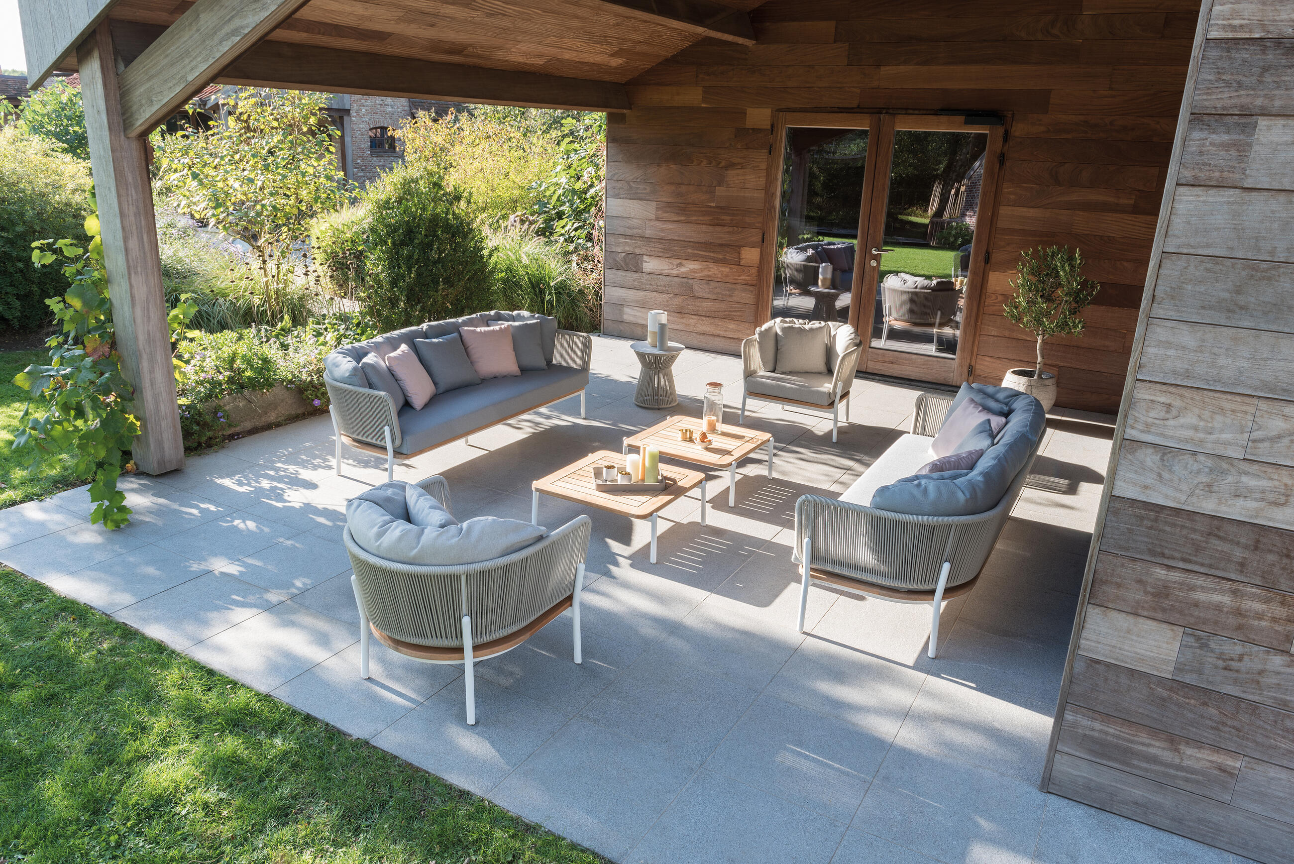 Venkovní čalounění a výplně s rychleschnoucí pěnou a látkami určenými pro exteriér umožňují rychlý odvod vody a návrat do provozu i po dešti.