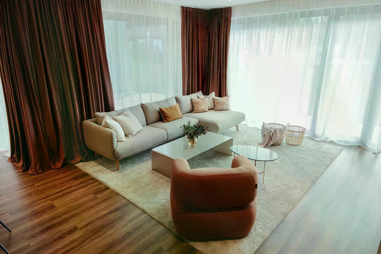Teplé tóny, pohovka SITS Moa, svítidlo Brokis a závěsy Casamance vytvářejí klidné místo k odpočinku.
