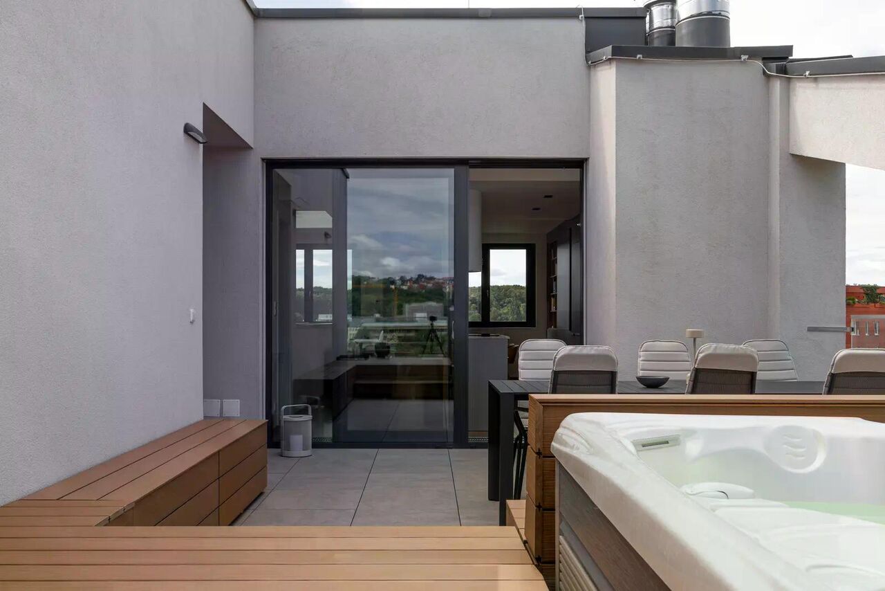 Kuchyně z přírodního dřeva, pohovka SITS, stolky 101 Copenhagen, venkovní žaluzie pro světelný komfort. Na terase vířivka zasazená do architektury domu. Realizace interiéru, kterému předcházela studie a vizualizace pro kompletní představu klienta o budoucím interiéru.