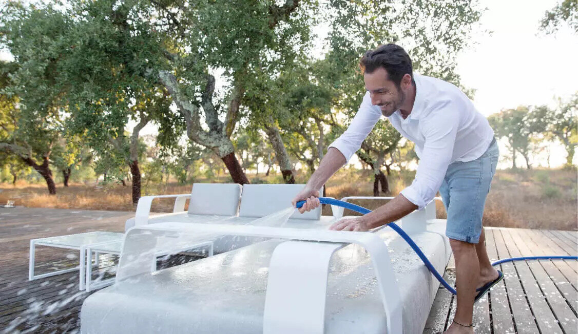 Než se pustíte do hloubkového čištění, nejprve svůj venkovní nábytek pečlivě prohlédněte. Zkontrolujte stav jednotlivých kusů, zda na nich nejsou praskliny, uvolněné spoje nebo jiné známky opotřebení. Následně odstraňte běžné nečistoty, jako jsou listí, prach a pavučiny. Stačí vám k tomu běžné pomůcky – smetáček, měkký hadřík, šetrný čisticí prostředek, voda nebo venkovní hadice.