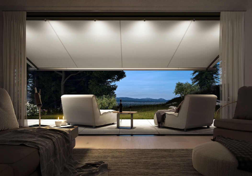 Markýza s osvětlením vytváří plnohodnotný venkovní prostor pro večerní posezení.