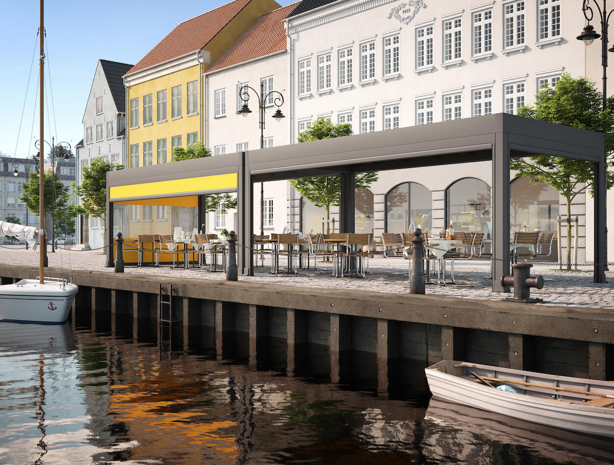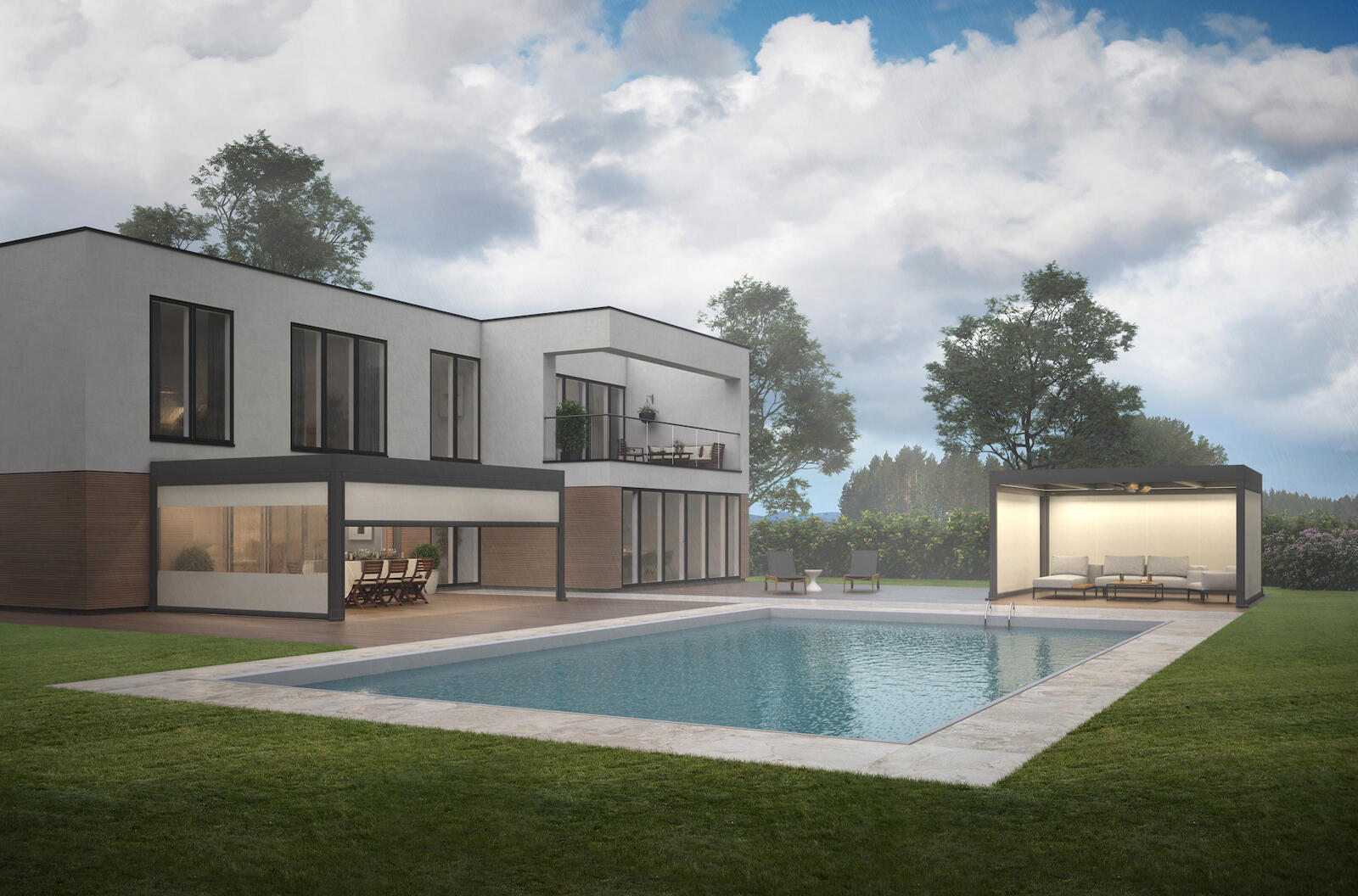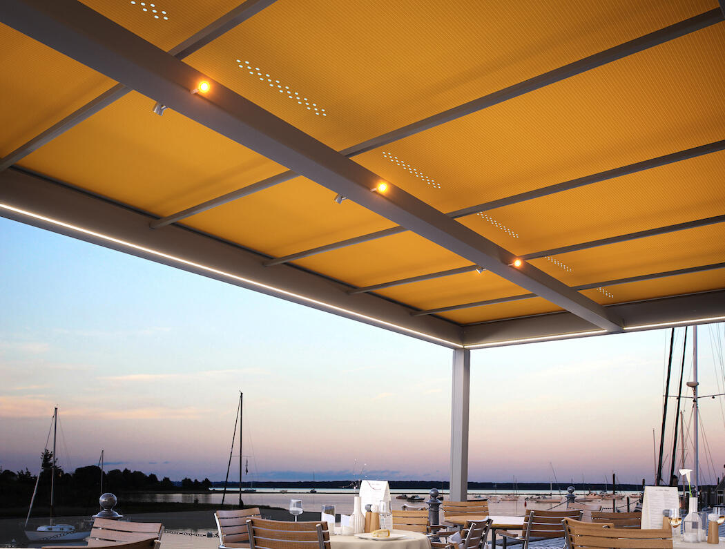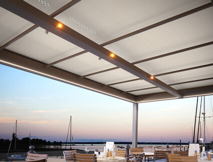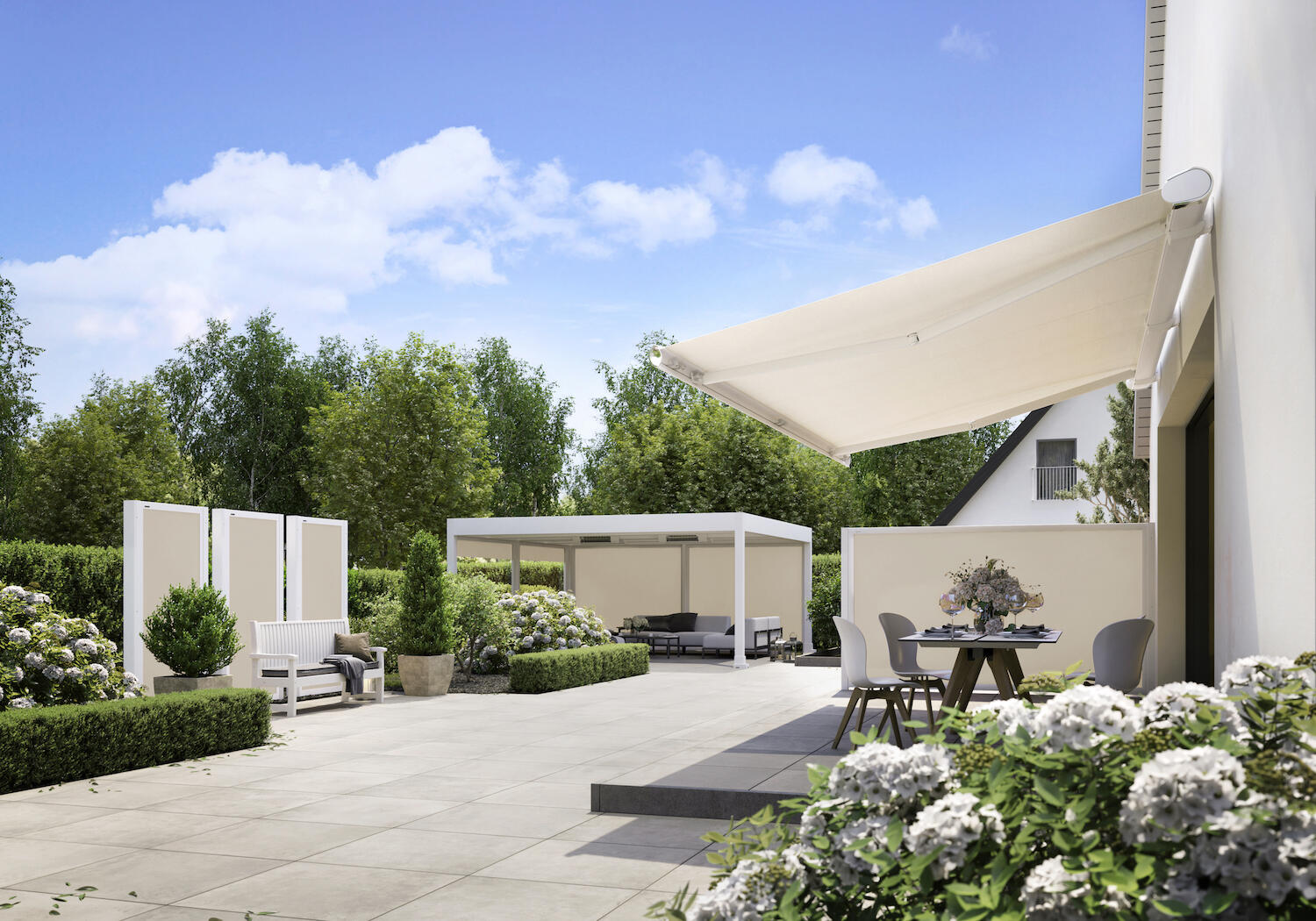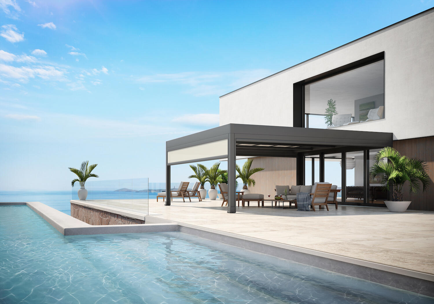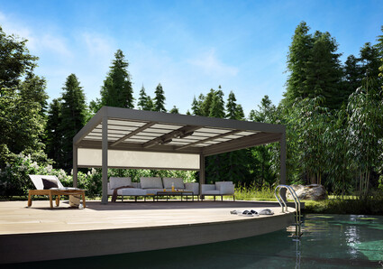 Pergola Markant je ideální alternativou k bioklimatickým pergolám. Její konstrukce umožňuje kotvení do domu či samostojnou montáž. Vodorovnou látkovou střechu lze otevřít a zajistit tak přísun světla pod pergolu.