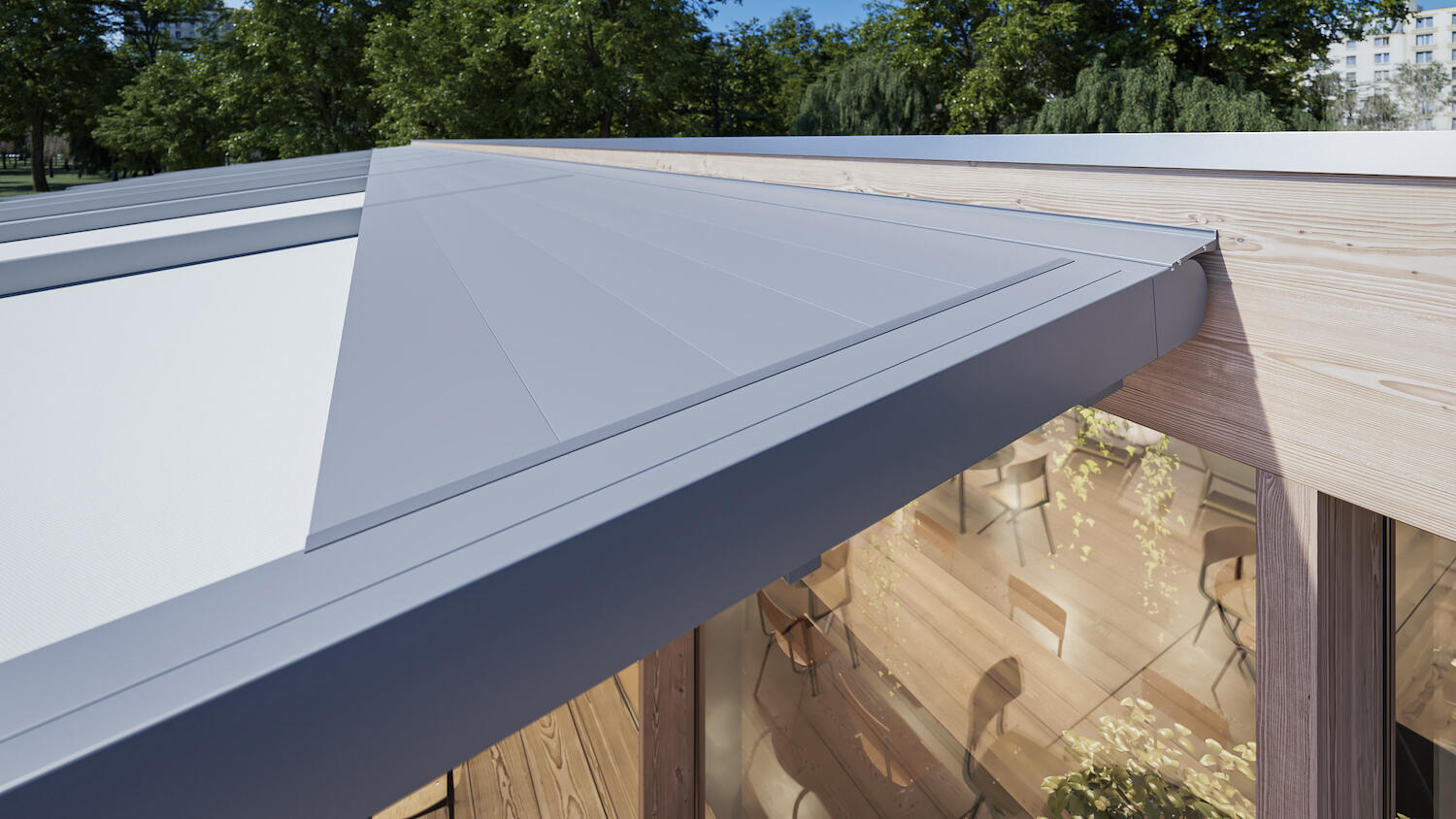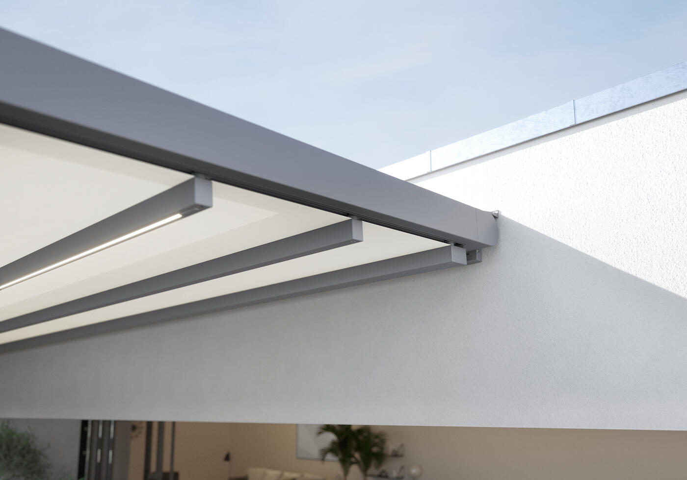 Pergola stretch pro kotvení na dům s látkovou střechou, která se skládá jako baldachýn do subtilního paketu. Vhodná pro krytí velkých ploch.