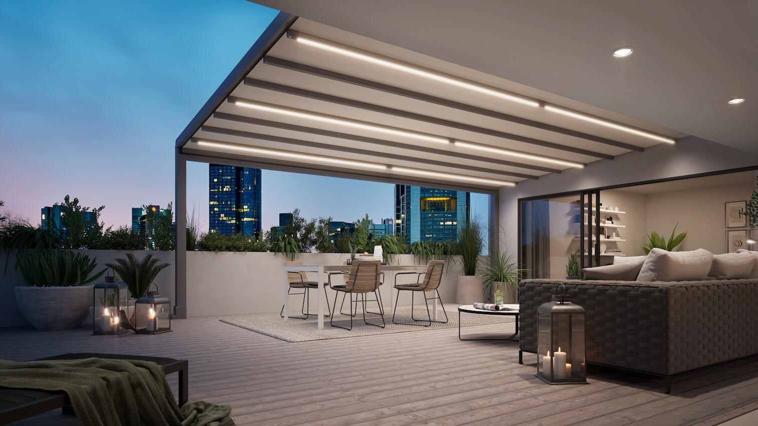 Pergoly německého výrobce Markilux jsou vhodné pro ochranu terasy nejen před sluncem, ale i deštěm, a to díky důmyslnému systému odvodu dešťové vody. Nezaskočí je ani vítr do rychlosti 37 km/h, který hlídá větrné čidlo. Pergoly lze vybavit motory Somfy s možností ovládání a automatizace skrze chytré zařízení. Pergoly vyrábíme s milimetrovou přesností na míru vašemu balkonu či terase.