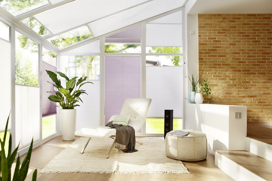 Plisovaná roleta z dvojité látky, ideální pro montáž do zasklívací lišty.