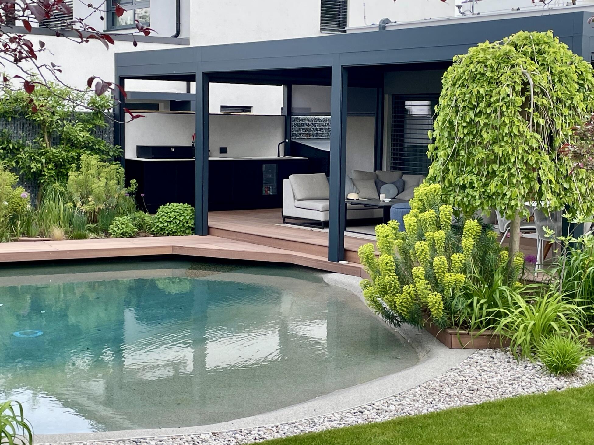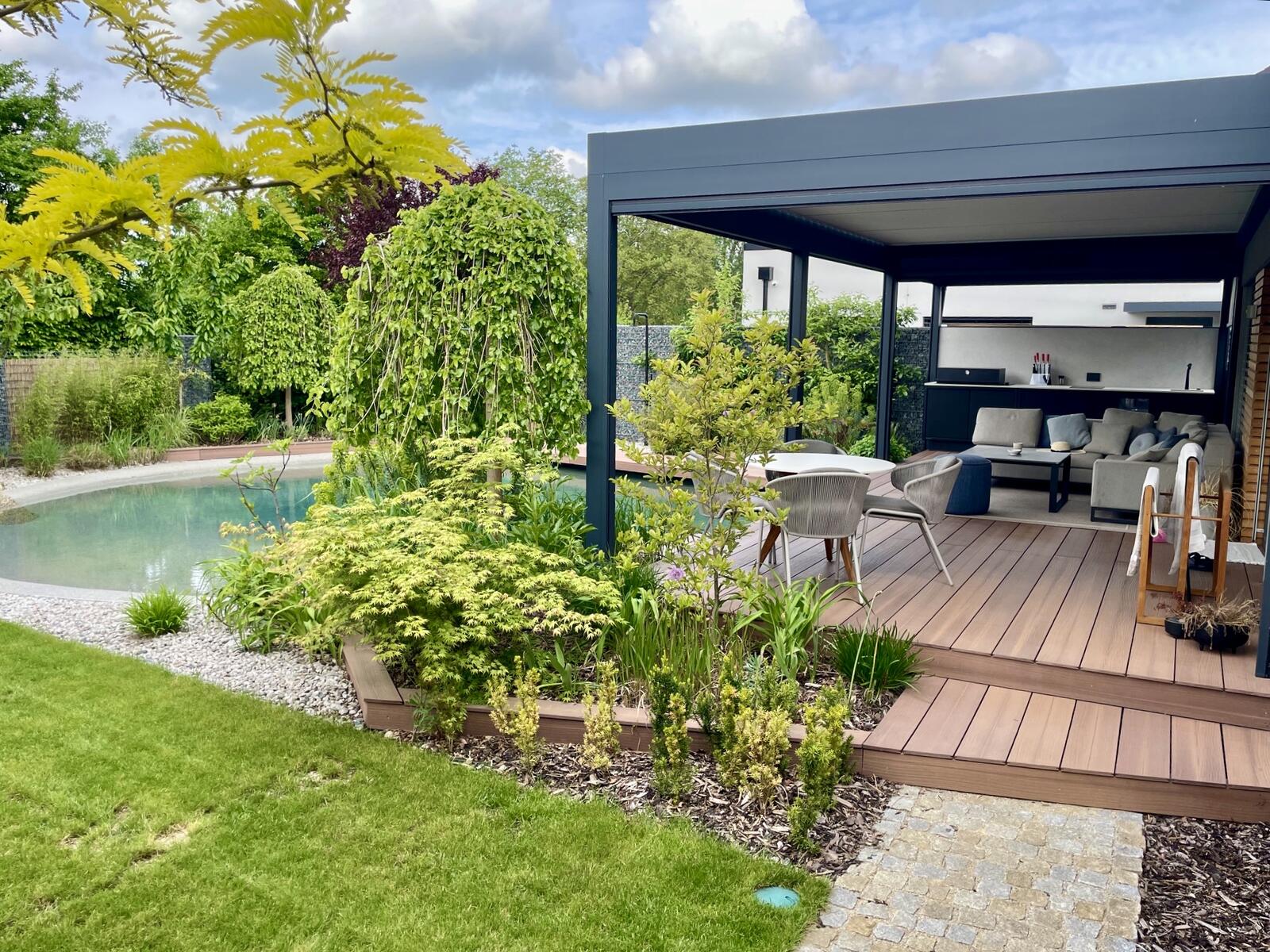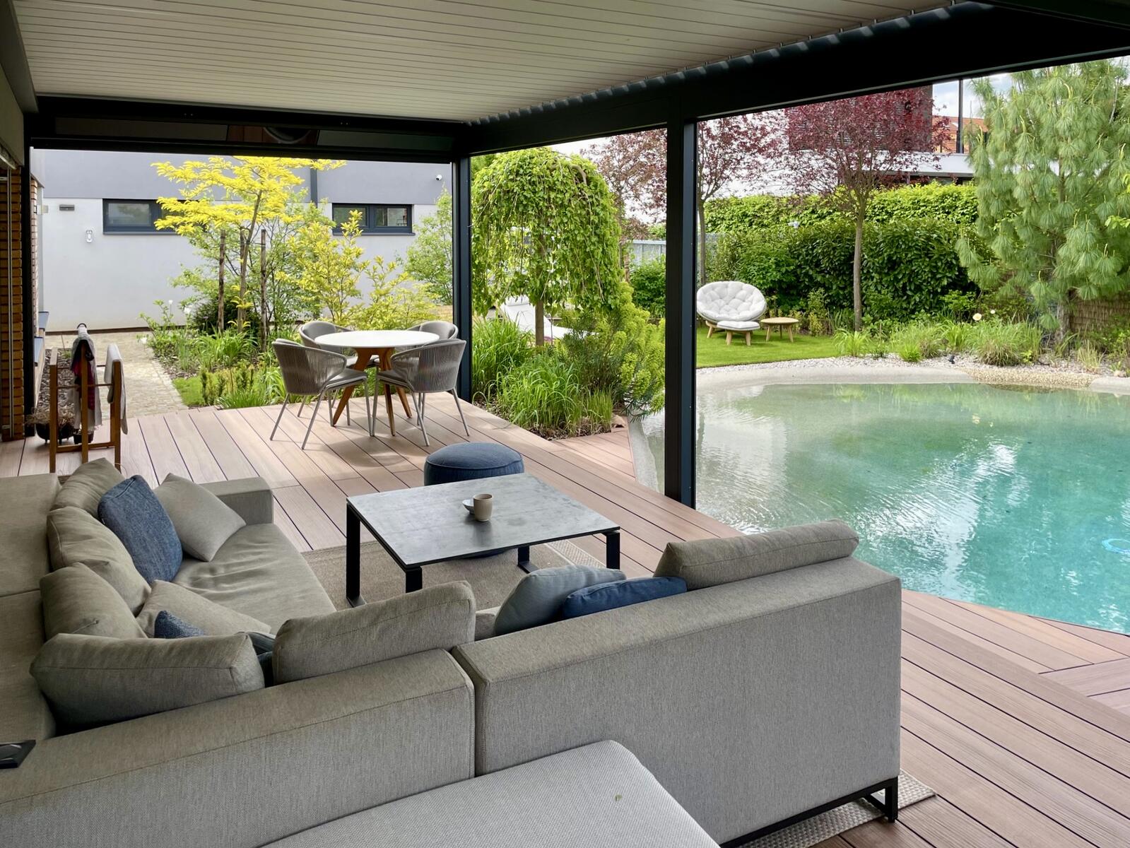 Ve spolupráci s dalšími dodavateli jsme navrhli a koordinovali architektonické řešení venkovní terasy a celé zahrady. Zásadním prvkem exteriéru se stal bazén, nad kterým vznikla pobytová terasa s bioklimatickou pergolou. Ta vytváří chráněný prostor pro každodenní pobyt venku a zároveň přirozeně propojuje dům se zahradou.