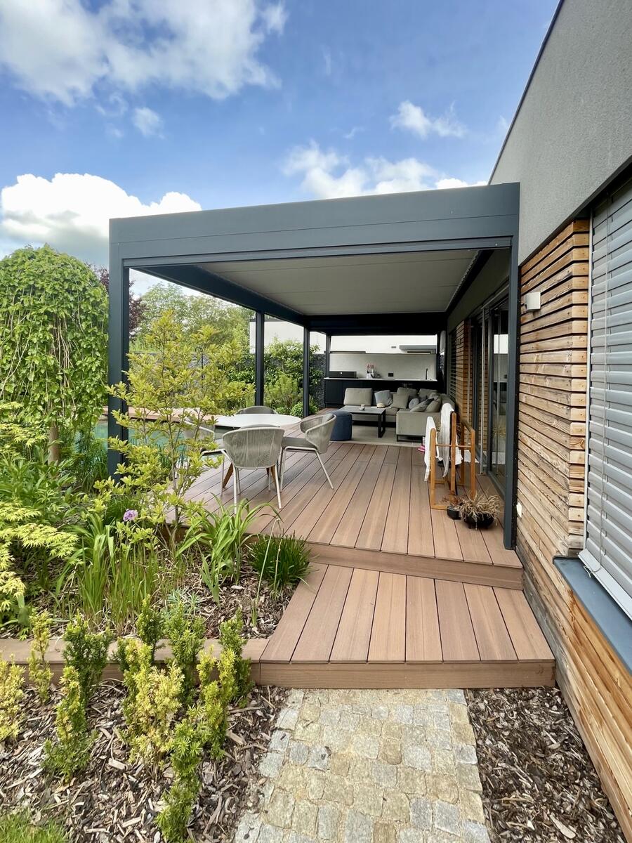 Bioklimatická pergola je vybavena naklápěcími lamelami, integrovaným osvětlením a screeny, které umožňují plynulou regulaci světla, stínu i soukromí. Součástí řešení jsou také venkovní žaluzie na domě, které podporují komfort bydlení a sjednocují architektonický výraz exteriéru.