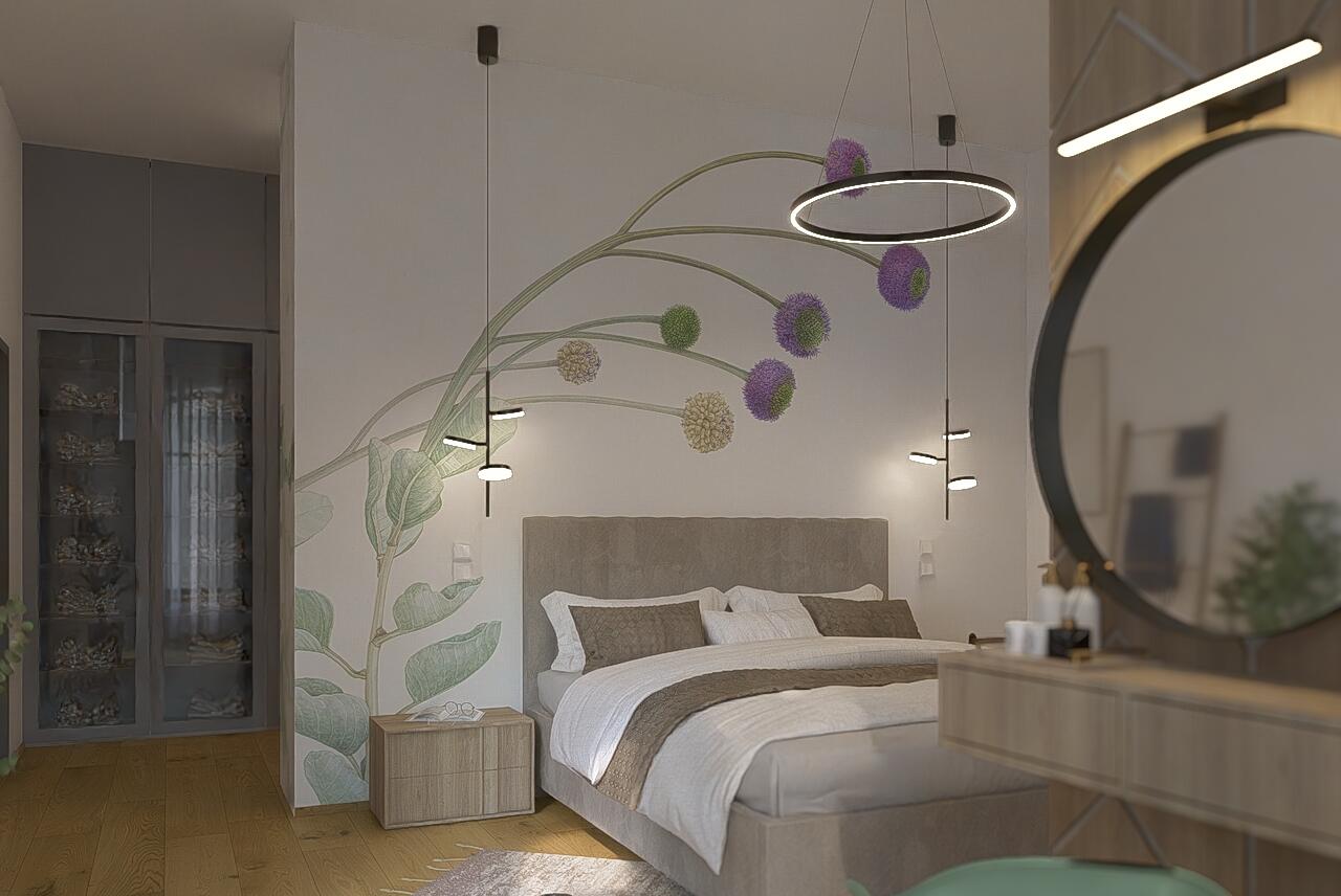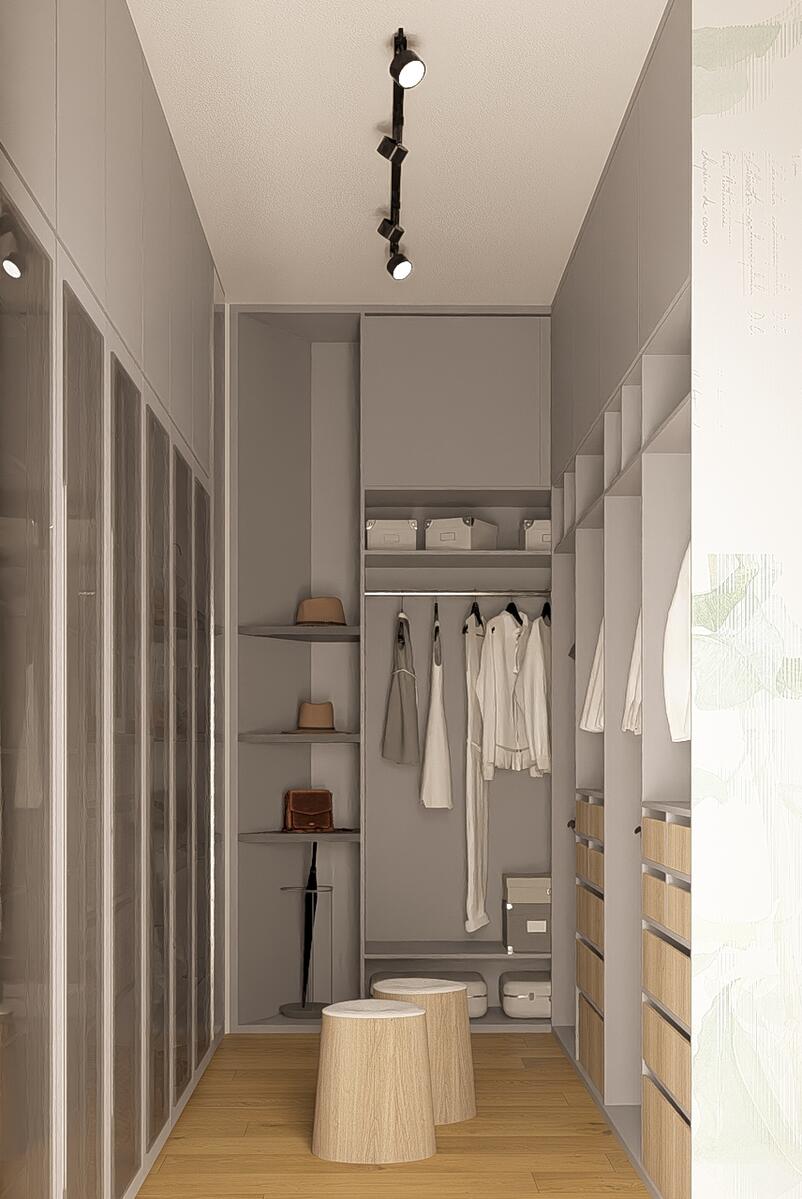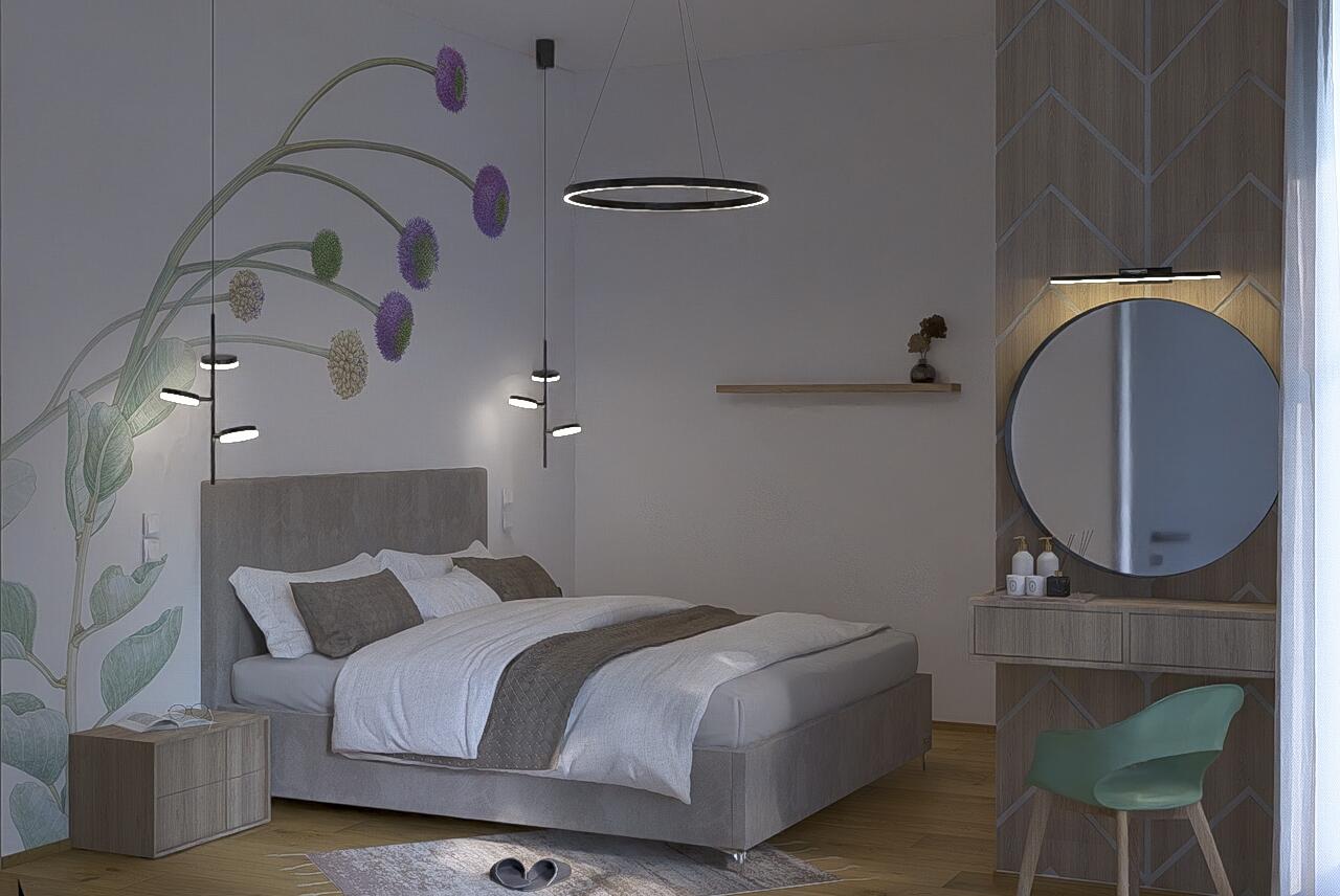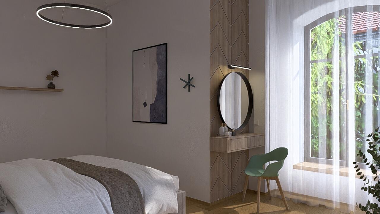 Velká okna vpouštějí do prostoru dostatek denního světla, které v kombinaci s přírodními materiály vytváří klidnou a vyváženou atmosféru. Ložnice i šatna navazují v jednotném tónu, doplněné o čalouněné prvky, textilie z kvalitních evropských látek a zakázkový nábytek na míru. Výsledkem je prostor, kde se design, funkčnost a pohodlí potkávají v dokonalé rovnováze.