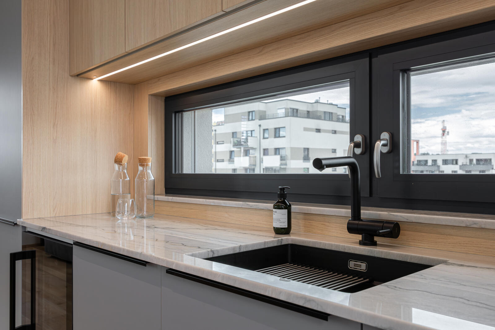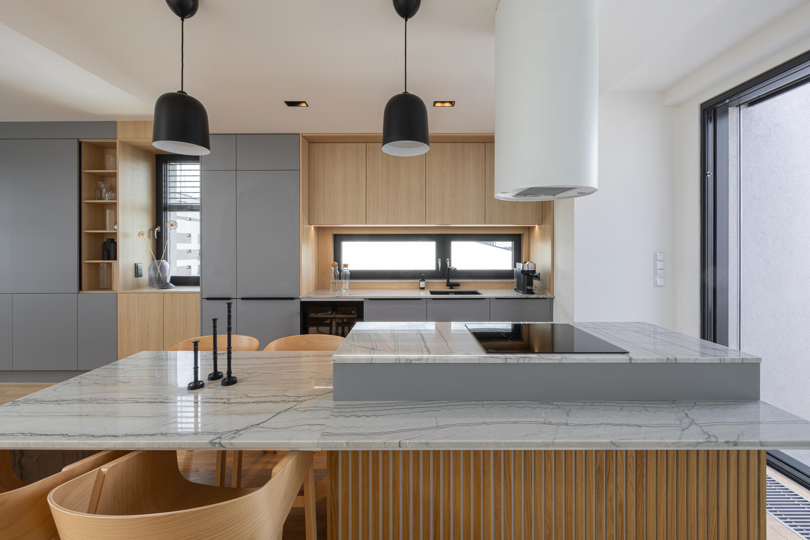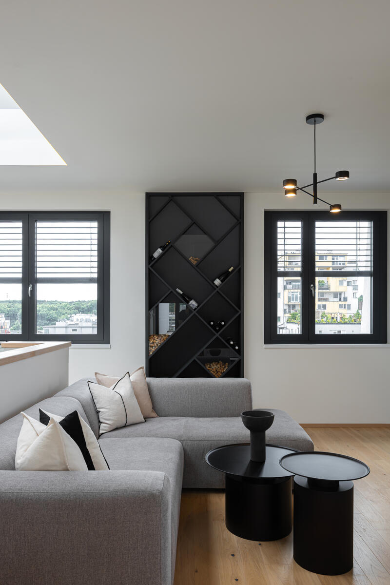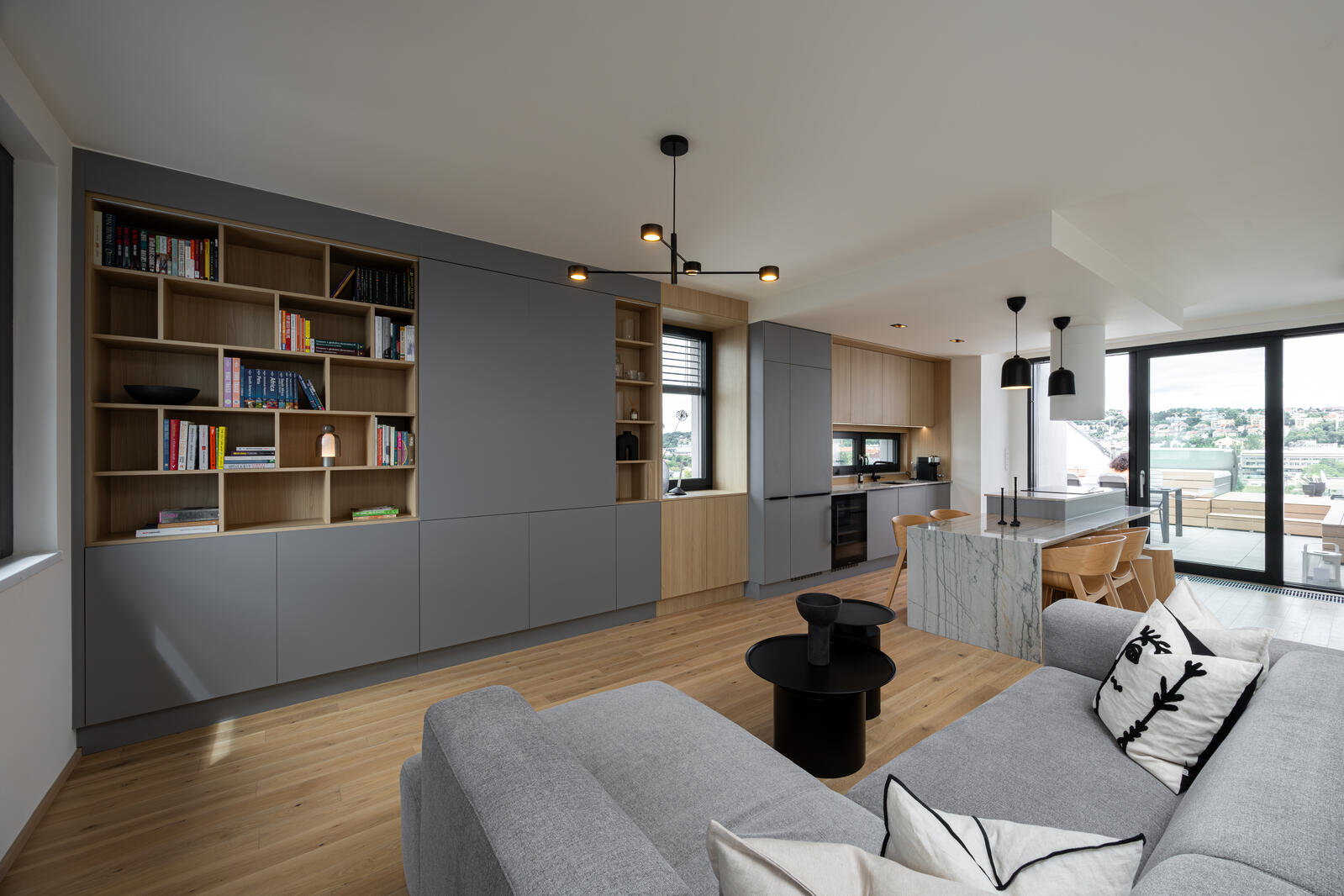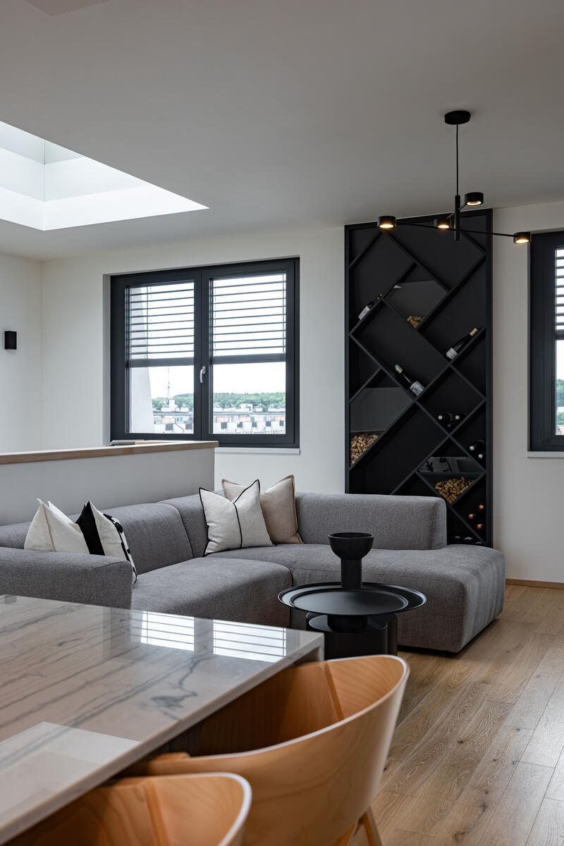 Dominantou prostoru je na míru vyrobená kuchyně v kombinaci přírodního dřeva, šedých ploch a mramoru, která působí nadčasově a přirozeně. Plynule přechází do obytné části s pohovkou SITS a konferenčními stolky 101 Copenhagen, které doplňují kontrastní černé akcenty.