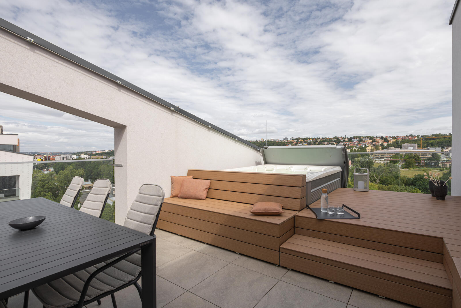 Součástí projektu bylo také řešení terasy na míru, včetně instalace vířivky zasazené tak, aby přirozeně navazovala na architekturu a charakter celého prostoru.
