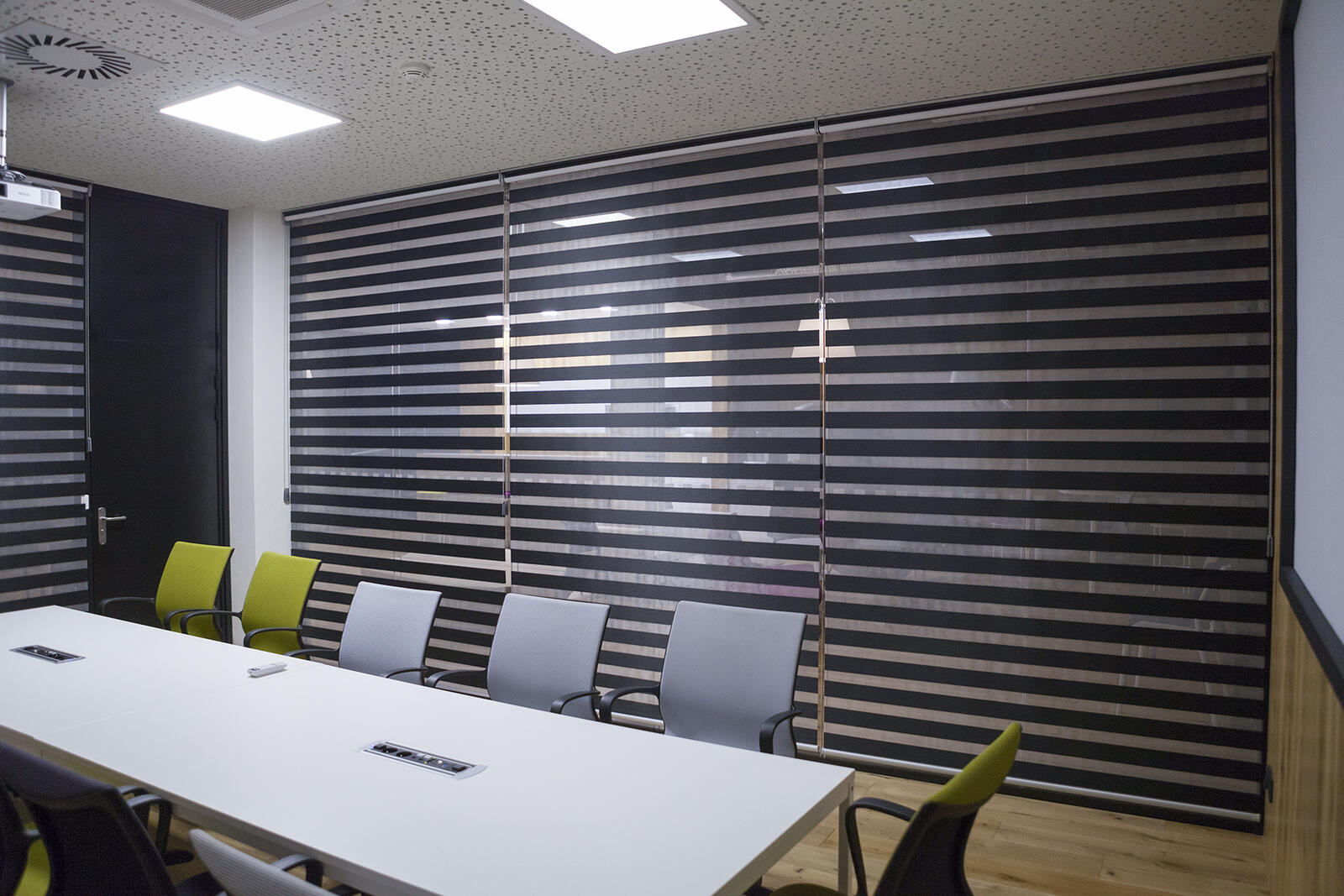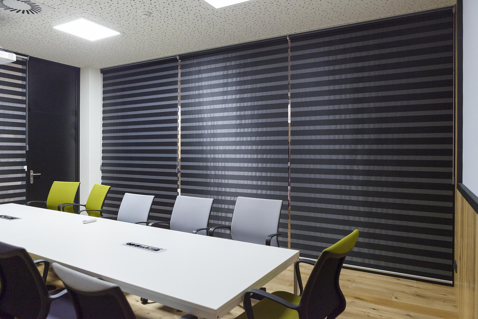 Součástí realizace bylo i zastínění interiérových jednacích místností, kde jsme použili twinrollo rolety. Ty umožňují flexibilně regulovat denní světlo a zároveň zachovat reprezentativní vzhled prostoru.