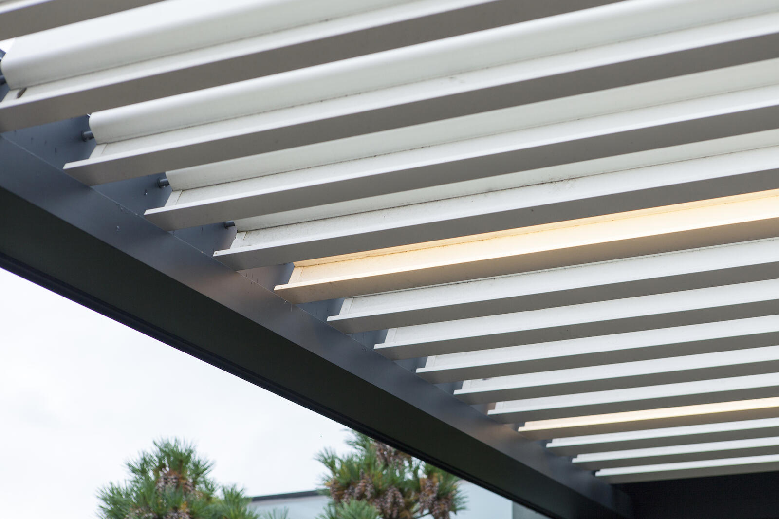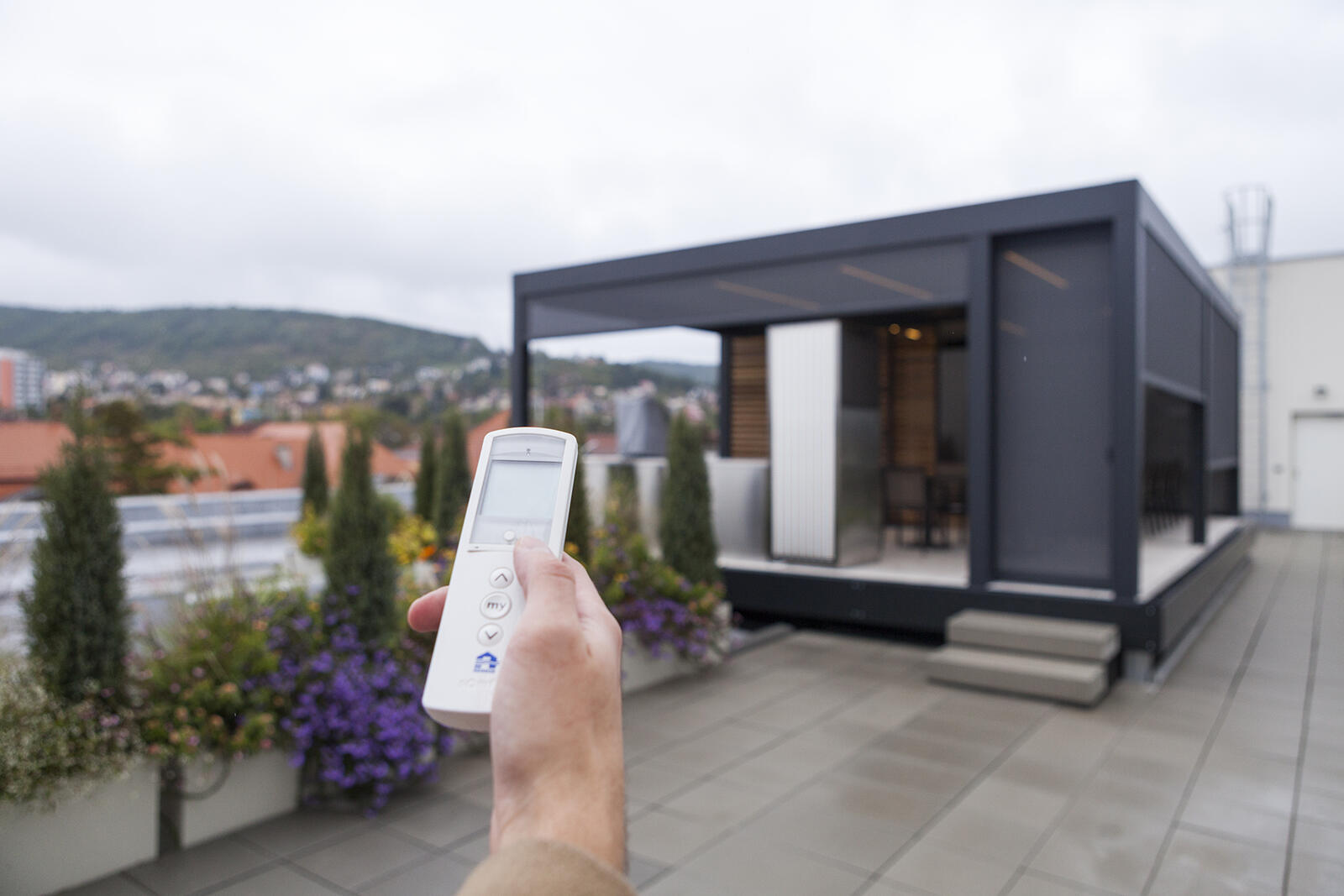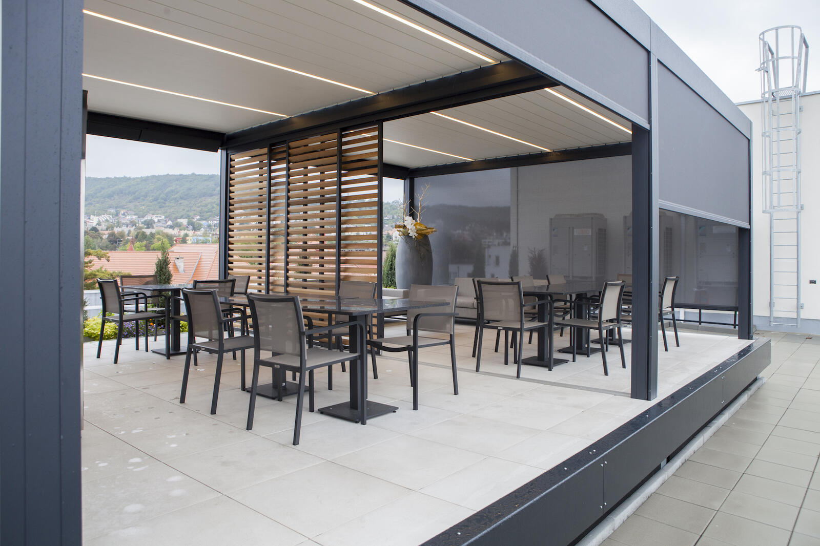 Pro maximální komfort byly pergoly osazeny screenovými roletami v zipovém vedení – ty zaručují pevnost, odolnost a také izolační funkci. Látka ze skelných vláken chrání nejen před sluncem, ale i větrem a deštěm. Celoroční využití pak podporuje možnost doplnění pergoly o infračervené topení.