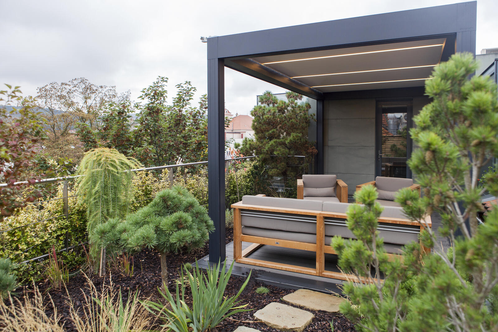 Pro sídlo společnosti Tipsport jsme navrhli a realizovali multifunkční střešní zázemí. První část slouží k pracovním schůzkám a jednáním, druhá je určena k odpočinku a načerpání energie. Oba prostory kryje bioklimatická pergola Camargue od belgického výrobce Renson, která díky naklápěcím lamelám umožňuje regulovat světlo i proudění vzduchu.