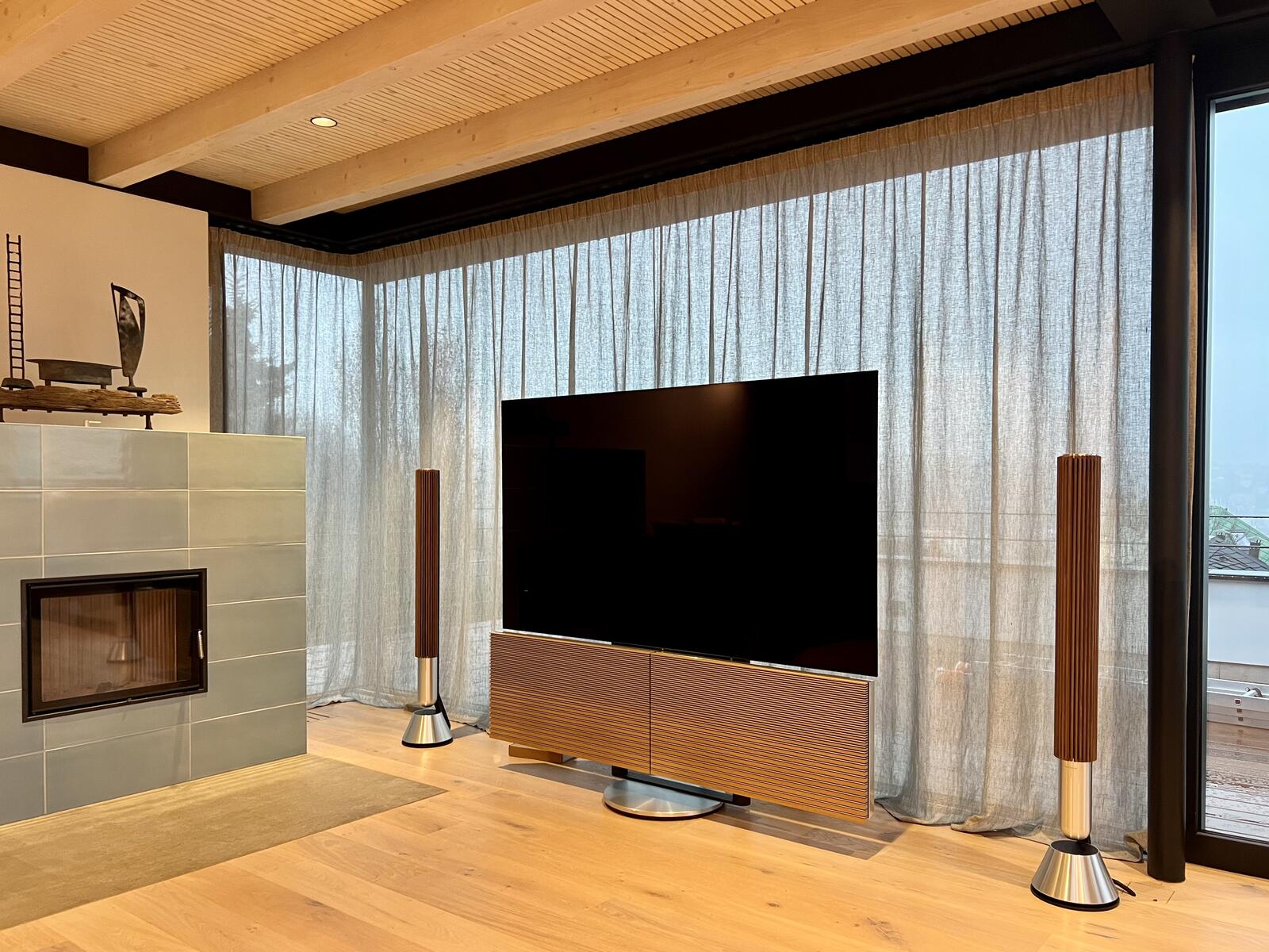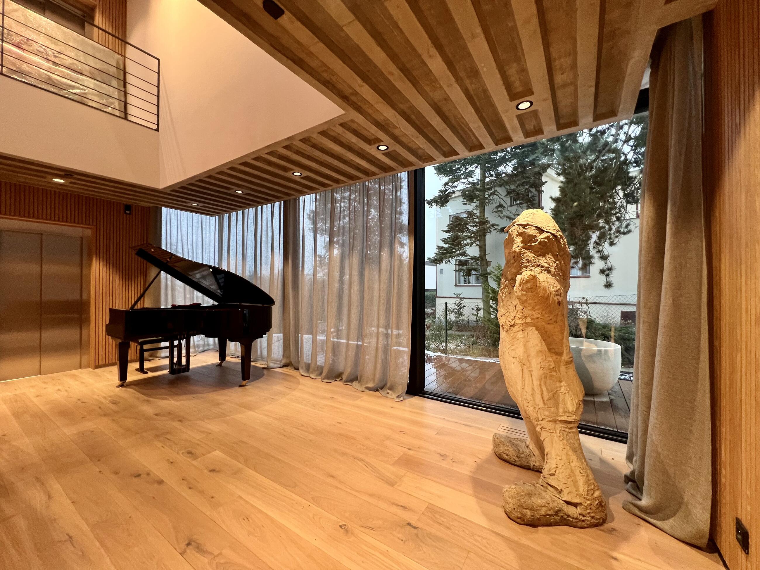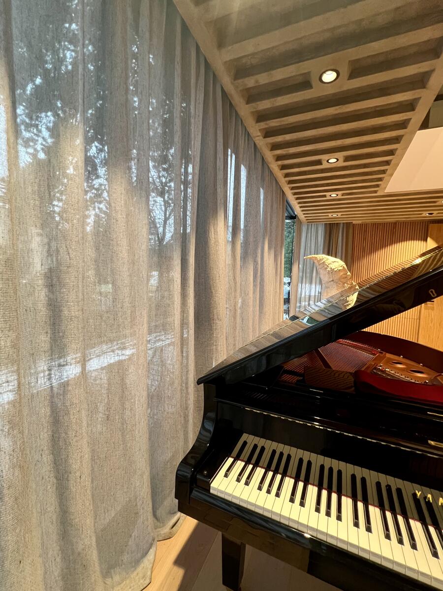 Interiér pracuje s velkorysým prosklením a přímým propojením s exteriérem. Řešení záclon bylo navrženo tak, aby umožnilo přesnou regulaci světla a zároveň zachovalo lehkost a otevřenost prostoru.