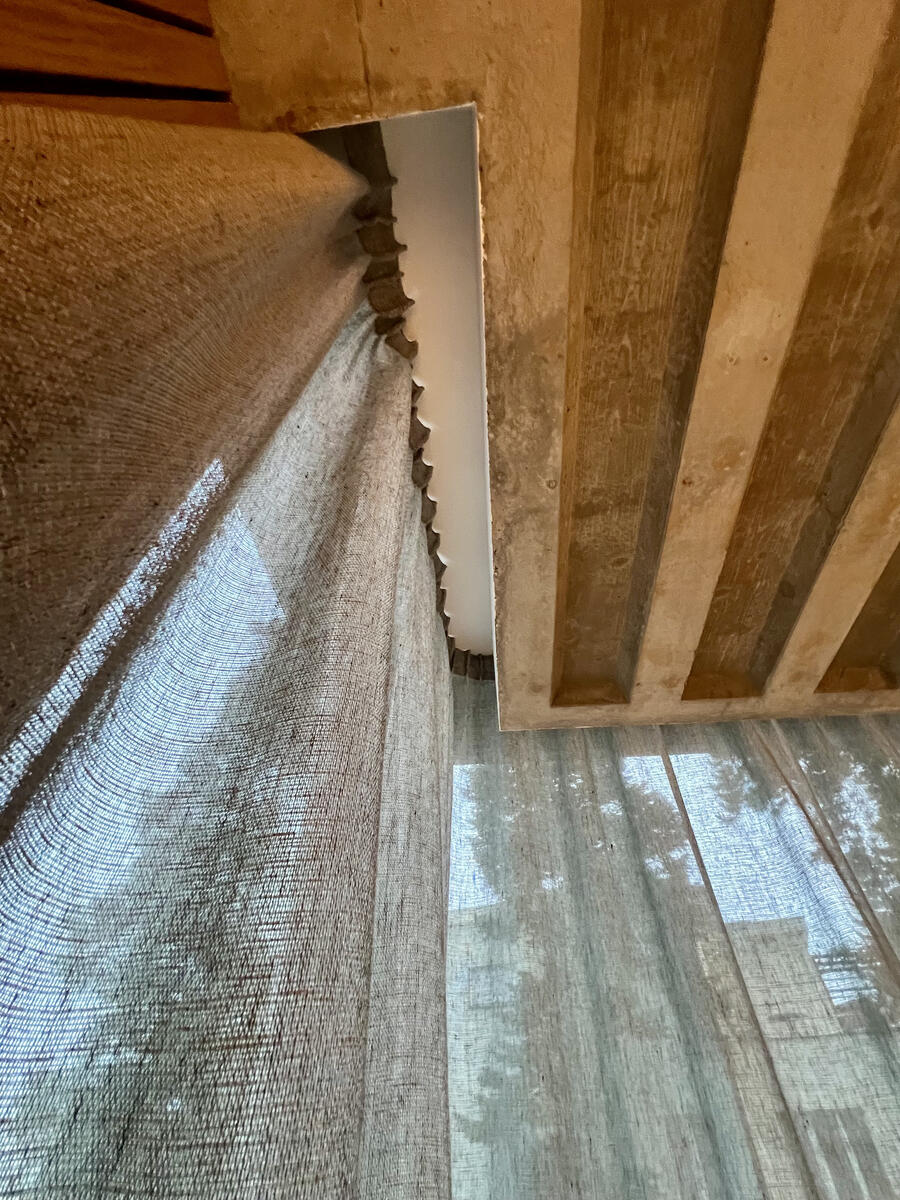 100% len s jemnou melange strukturou funguje jako přirozený filtr světla, změkčuje přímé slunce, ale zachovává vizuální kontakt s exteriérem. Díky šíři 310 cm bylo možné navrhnout plynulé řešení bez napojování jednotlivých pásů, což je u velkých prosklených ploch zásadní.