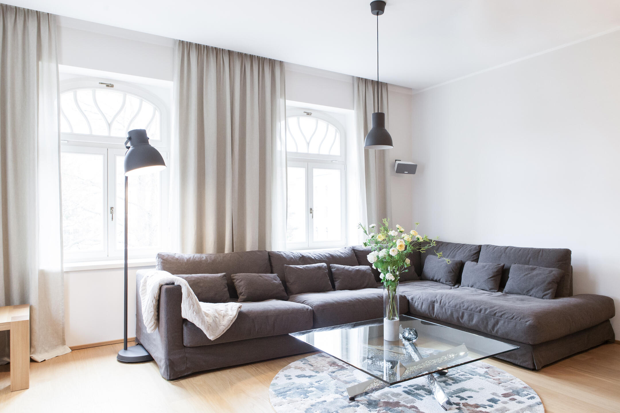 Atmosféru doplňuje kulatý koberec Stepevi a výrazný konferenční stůl Sovet s designovou skleněnou deskou a kovovou podnoží. Kombinace těchto prvků vytváří elegantní, ale přitom útulné prostředí.