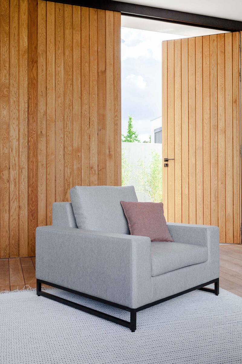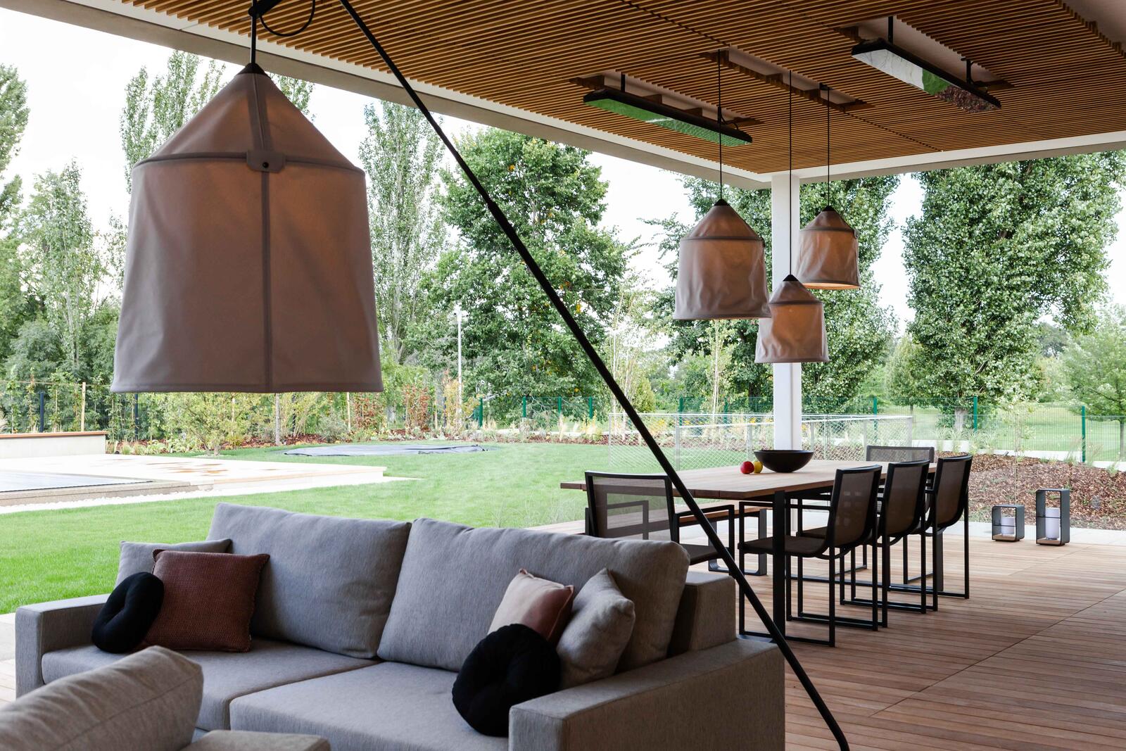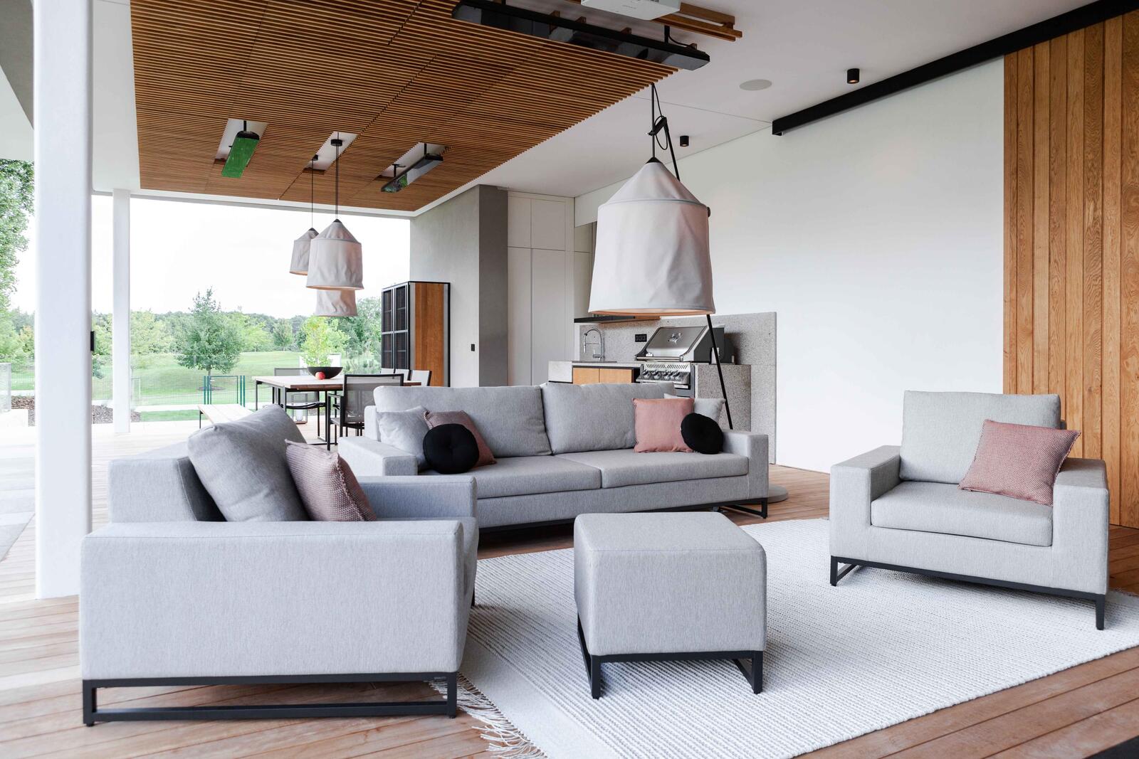 Dominantou terasy je sedací sestava Manutti Zendo – pohovka doplněná o křesla a venkovní koberec, které společně vytvářejí pohodlnou lounge zónu. Pro větší útulnost jsme přidali i venkovní polštáře a dekorativní lampy Manutti, které po setmění prostor příjemně zútulní.