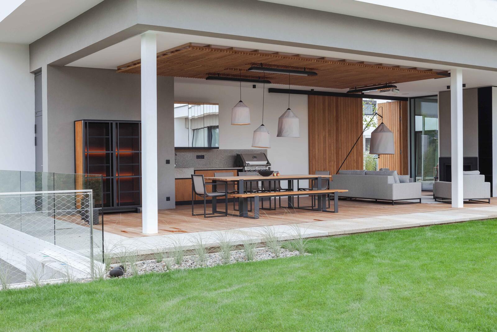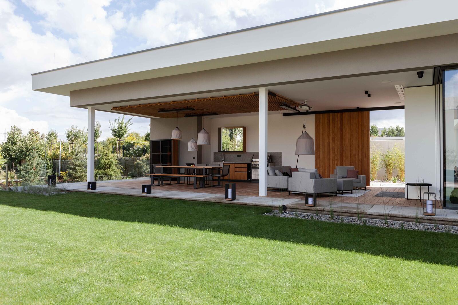 Součástí terasy je také venkovní kuchyň a komoda na nádobí, které doplňují praktické využití prostoru.