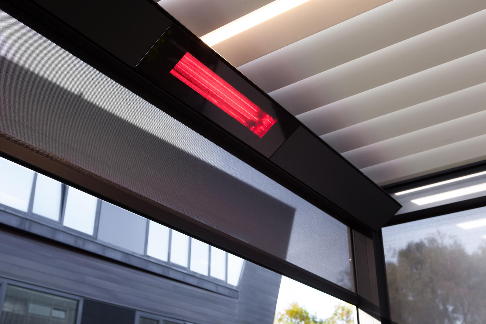 Pergola je doplněná o integrované LED osvětlení a infra topení, které zajišťují příjemnou atmosféru i během chladnějších večerů.