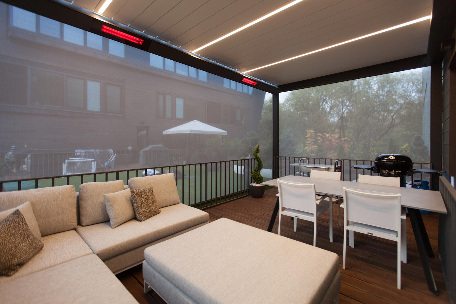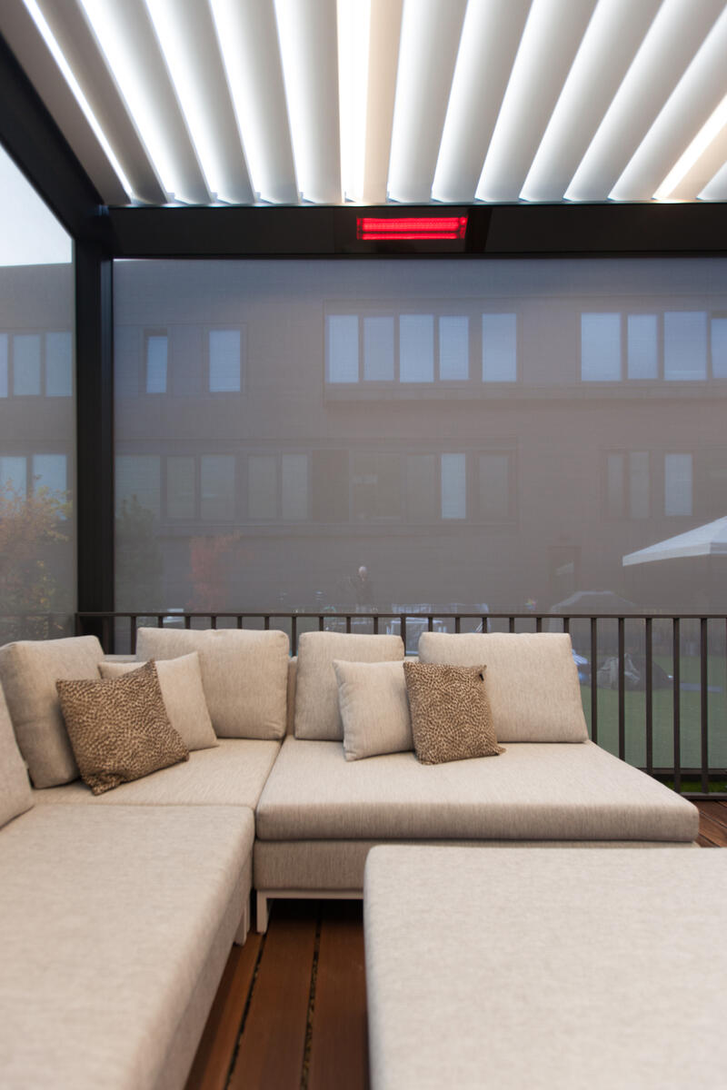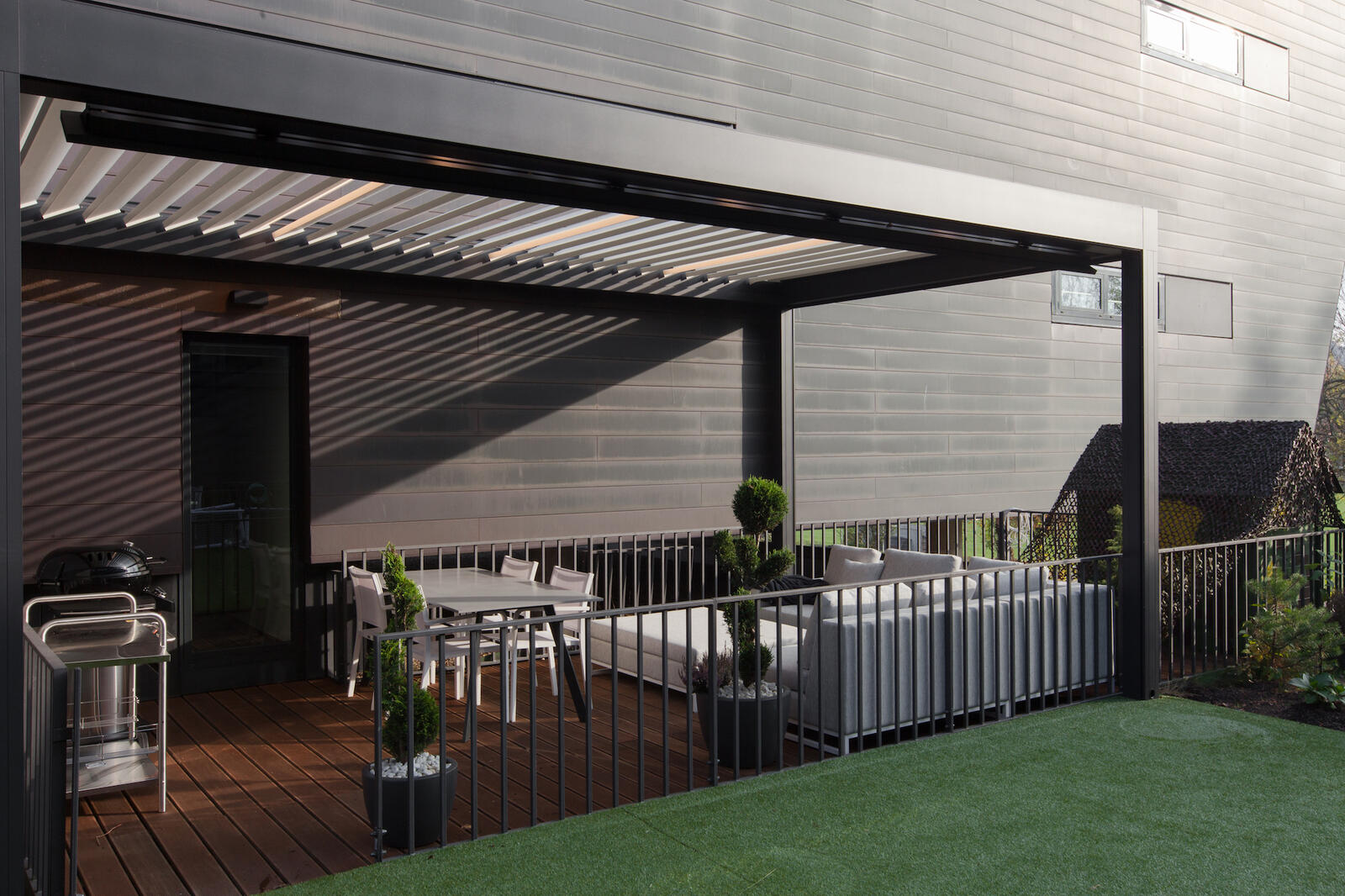 Dominantou terasy je lamelová pergola Renson Camargue, vybavená screenovými roletami ZipScreen pro maximální ochranu před sluncem, větrem i nežádoucími pohledy.