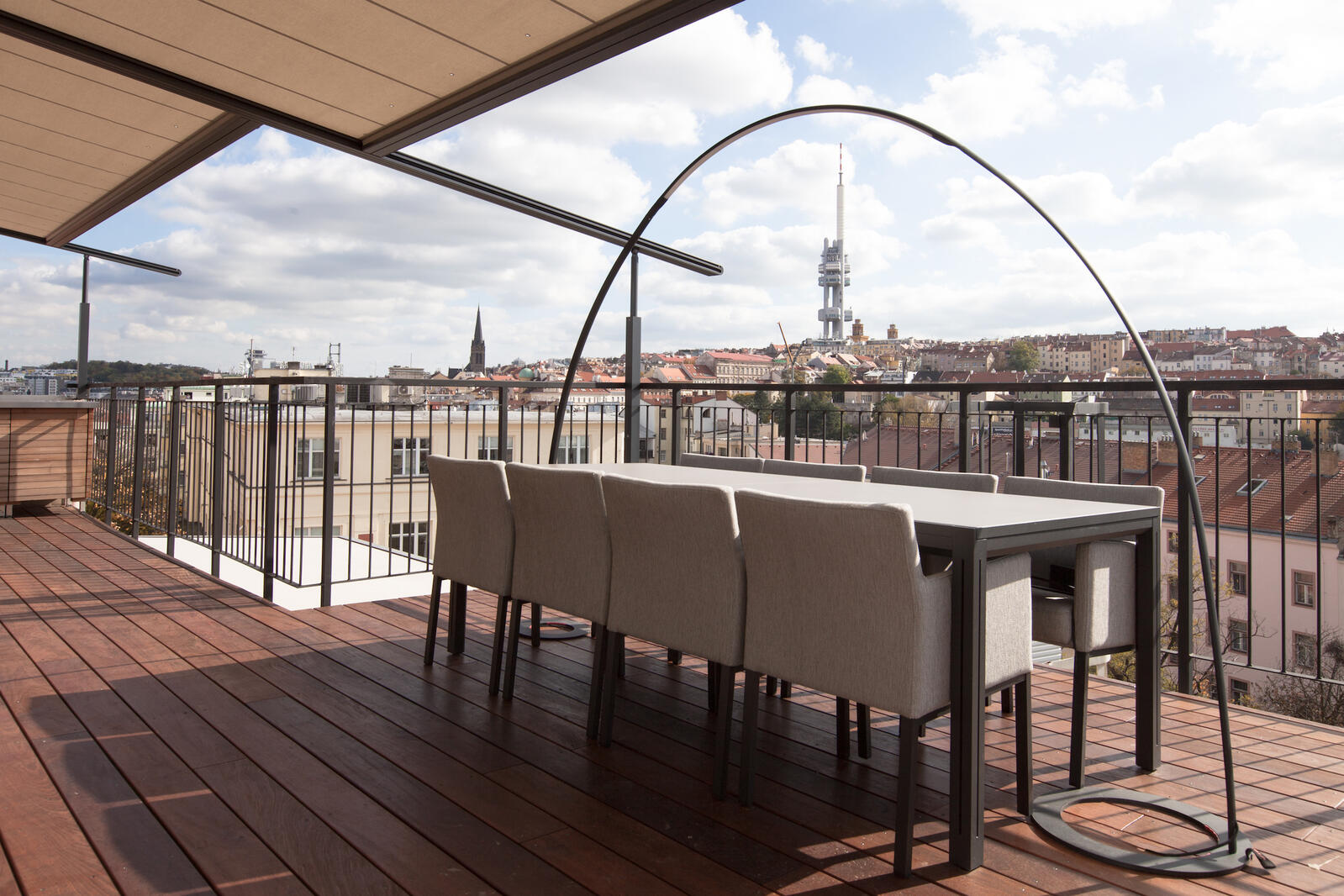 Soukromý apartmán na Žižkově nabízí dvě terasy, které jsme vybavili tak, aby splňovaly různé potřeby majitelů.