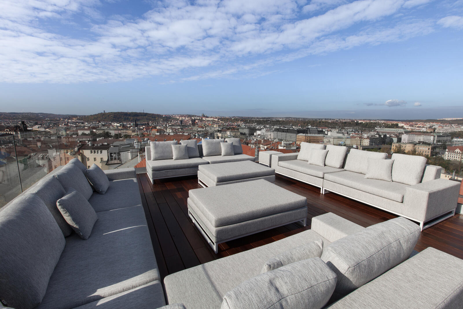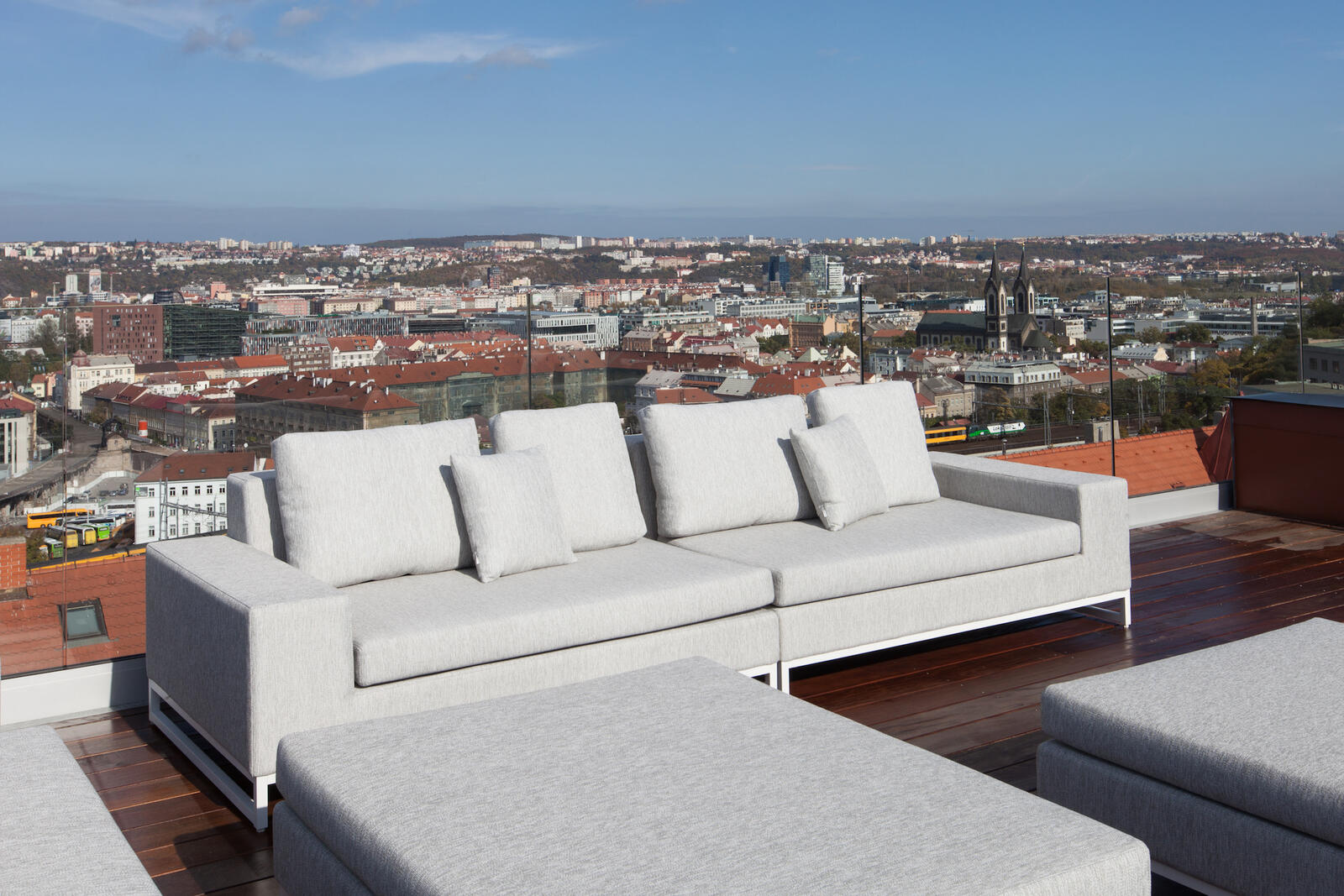 Na horní terase se nachází velkorysá modulová pohovka Zendo od Manutti. Díky flexibilnímu systému modulů lze posezení snadno přizpůsobit — od klidného odpočinku po společenské večery.