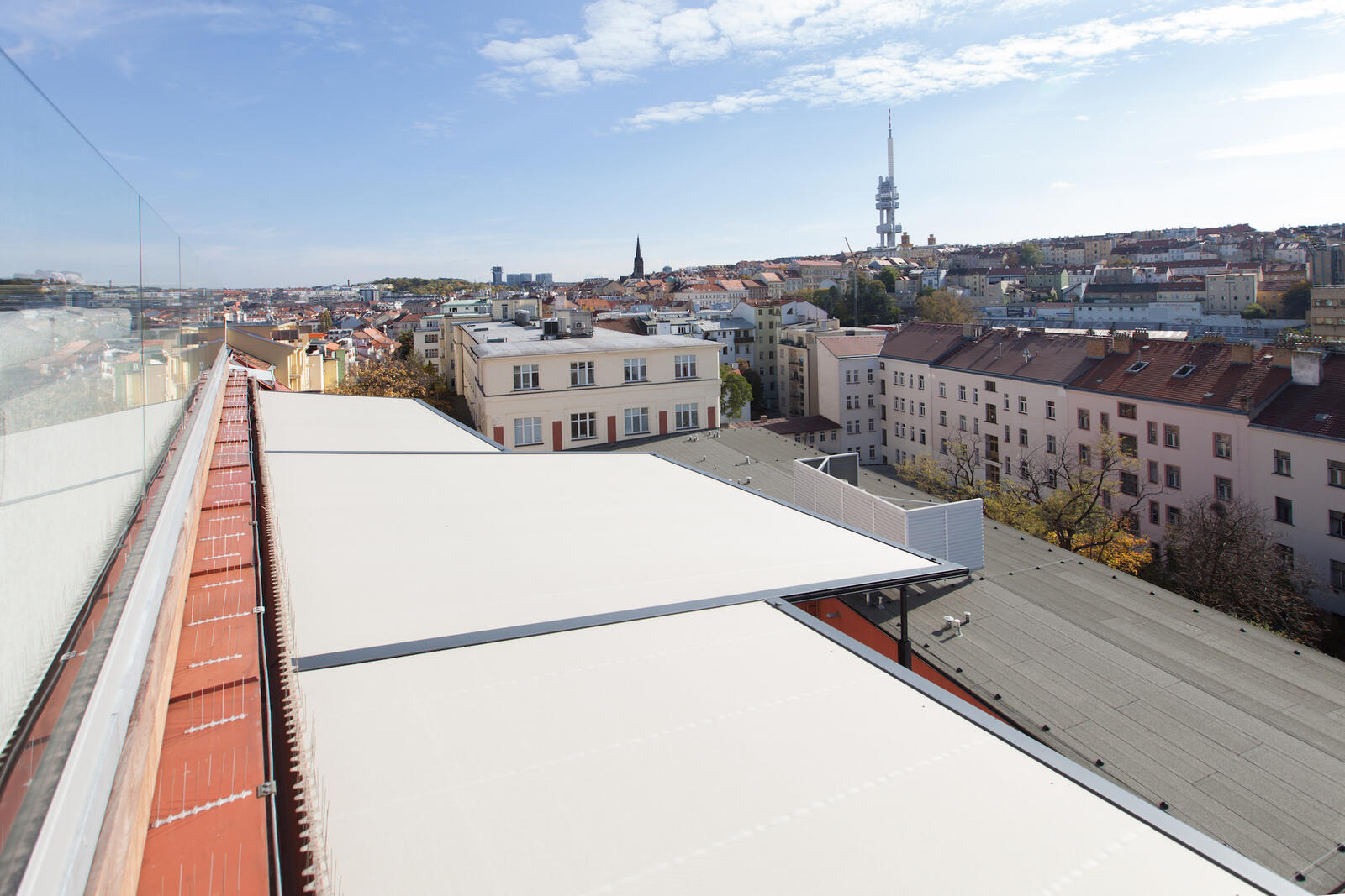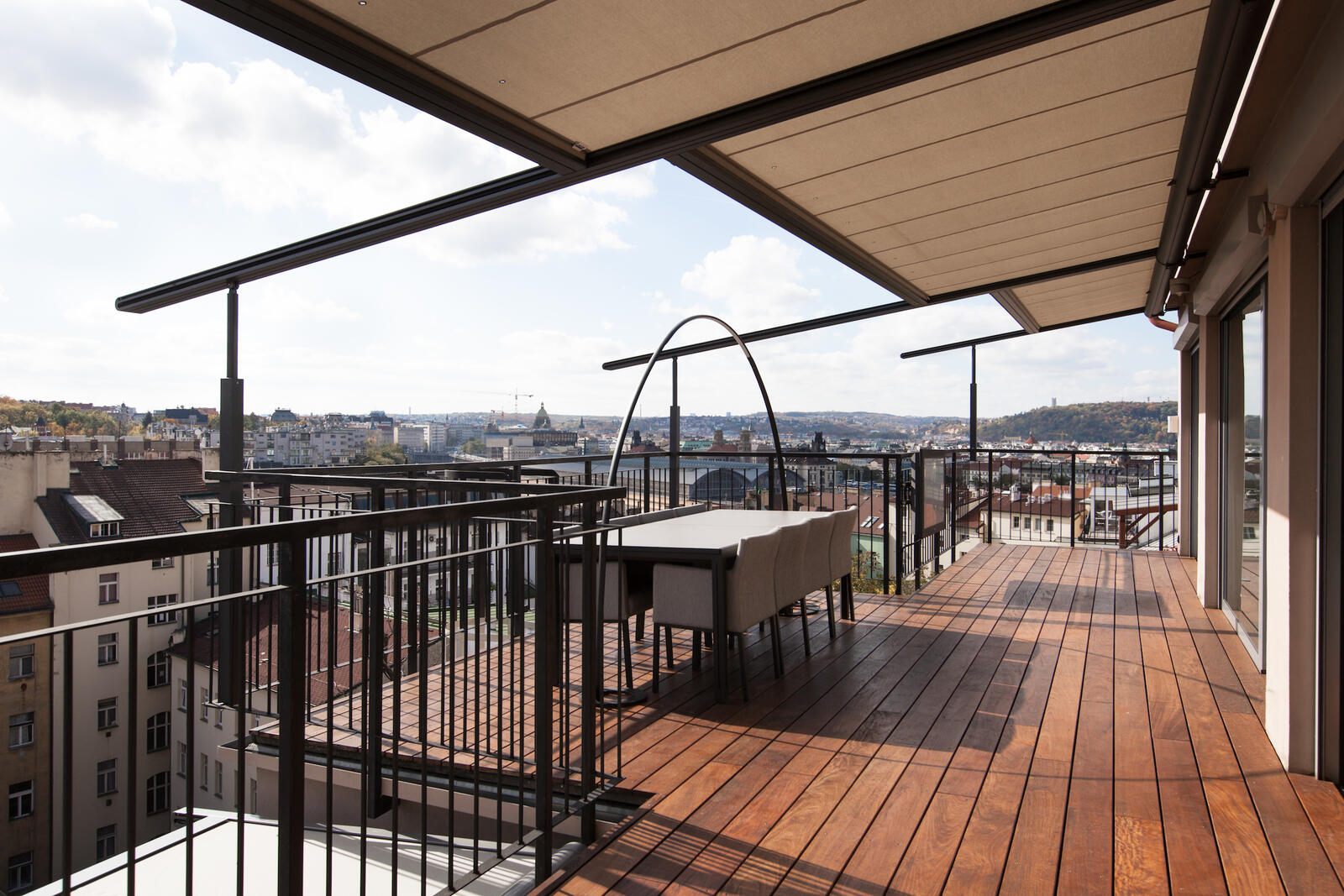 Výsledkem jsou dvě úrovně teras, které spojují sofistikovaný design, funkční detaily a neopakovatelný výhled na Prahu.