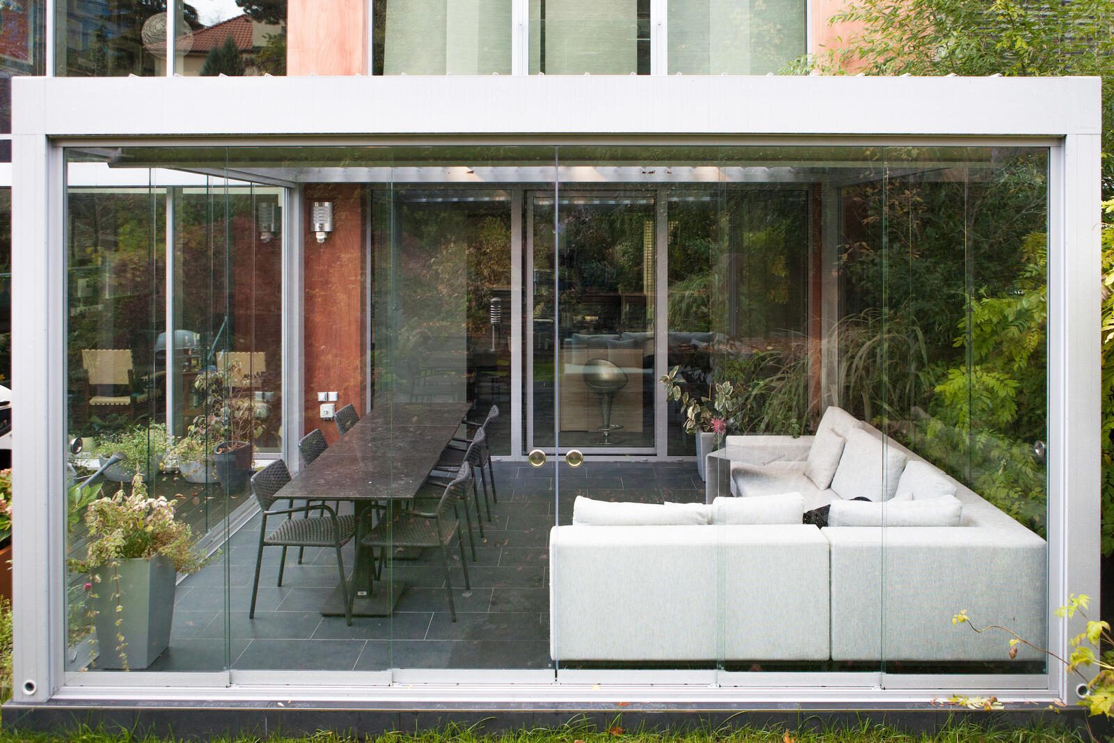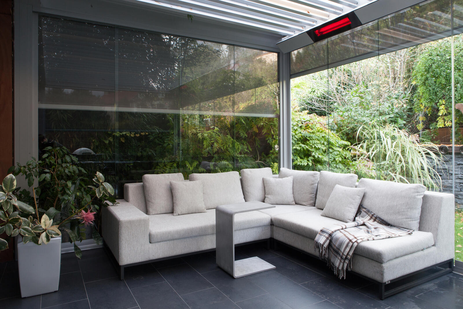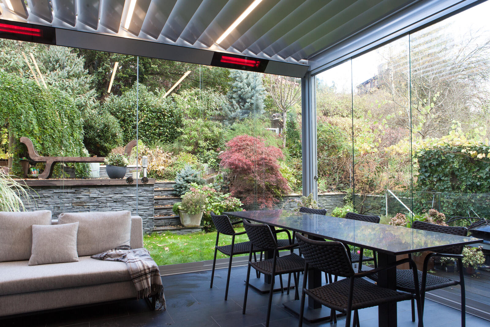 Pergola Renson Camargue přetvořila část zahrady v plnohodnotný obytný prostor.