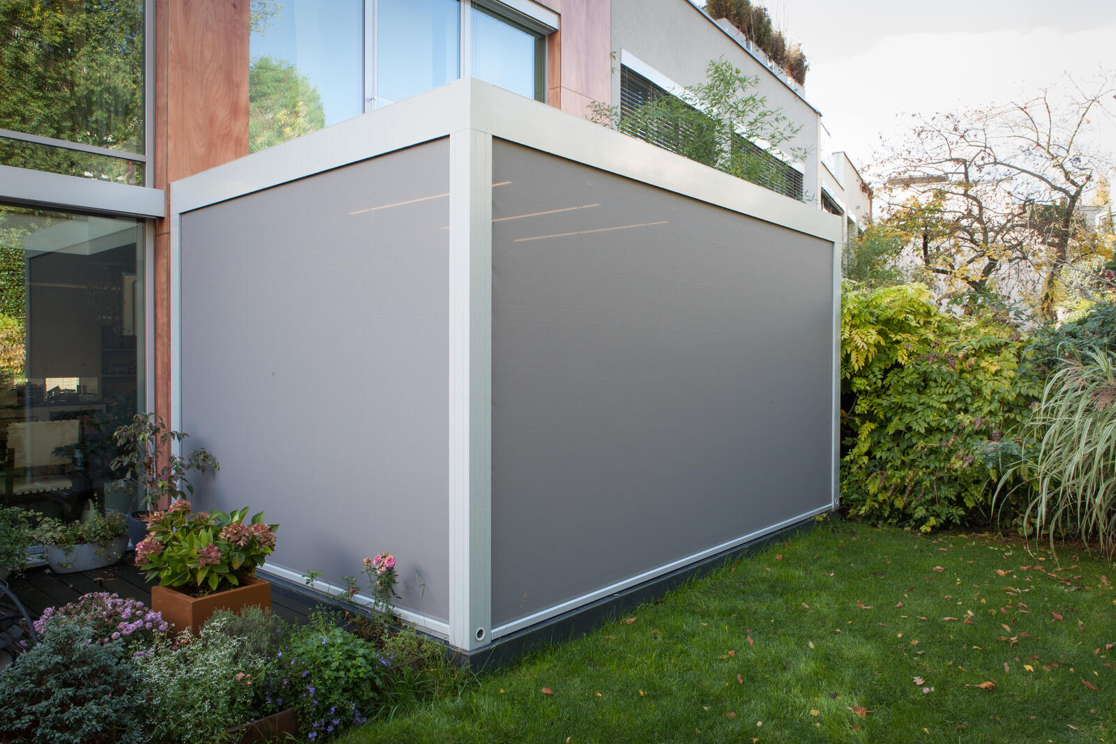 Díky naklápěcím lamelám lze snadno regulovat světlo i proudění vzduchu, screenové rolety pak zajišťují soukromí i ochranu před nepřízní počasí. Celý prostor doplňuje pohodlná modulární sedačka a jídelní set, které z něj dělají místo pro odpočinek i společenská setkání.