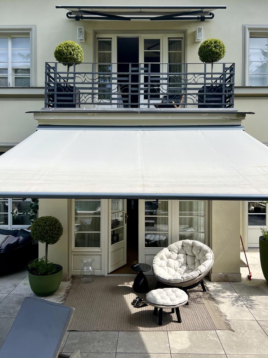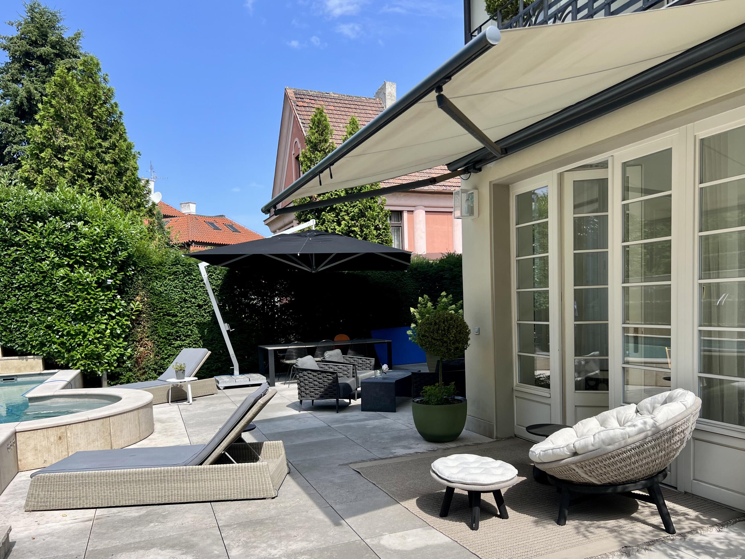 V jídelní části terasy nebylo možné markýzu kotvit do fasády domu. Pro tuto zónu byl zvolen venkovní slunečník značky Manutti, který vytváří plnohodnotný stín a zároveň zůstává flexibilní. Díky možnosti polohování lze stín snadno přizpůsobit aktuální poloze slunce i způsobu využití prostoru během dne.