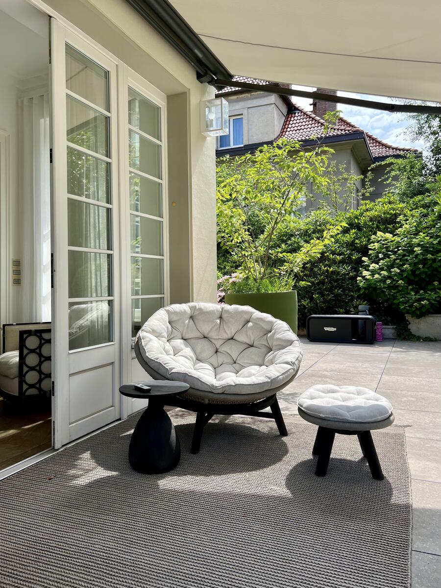 U domu vznikla klidová zóna s papasan křeslem z kolekce Manutti Sandua. Tento typ venkovního křesla nabízí vysoký komfort a funguje jako samostatné místo pro odpočinek. Zónu doplňuje venkovní koberec, který ji vizuálně vymezuje a zvyšuje komfort při používání.