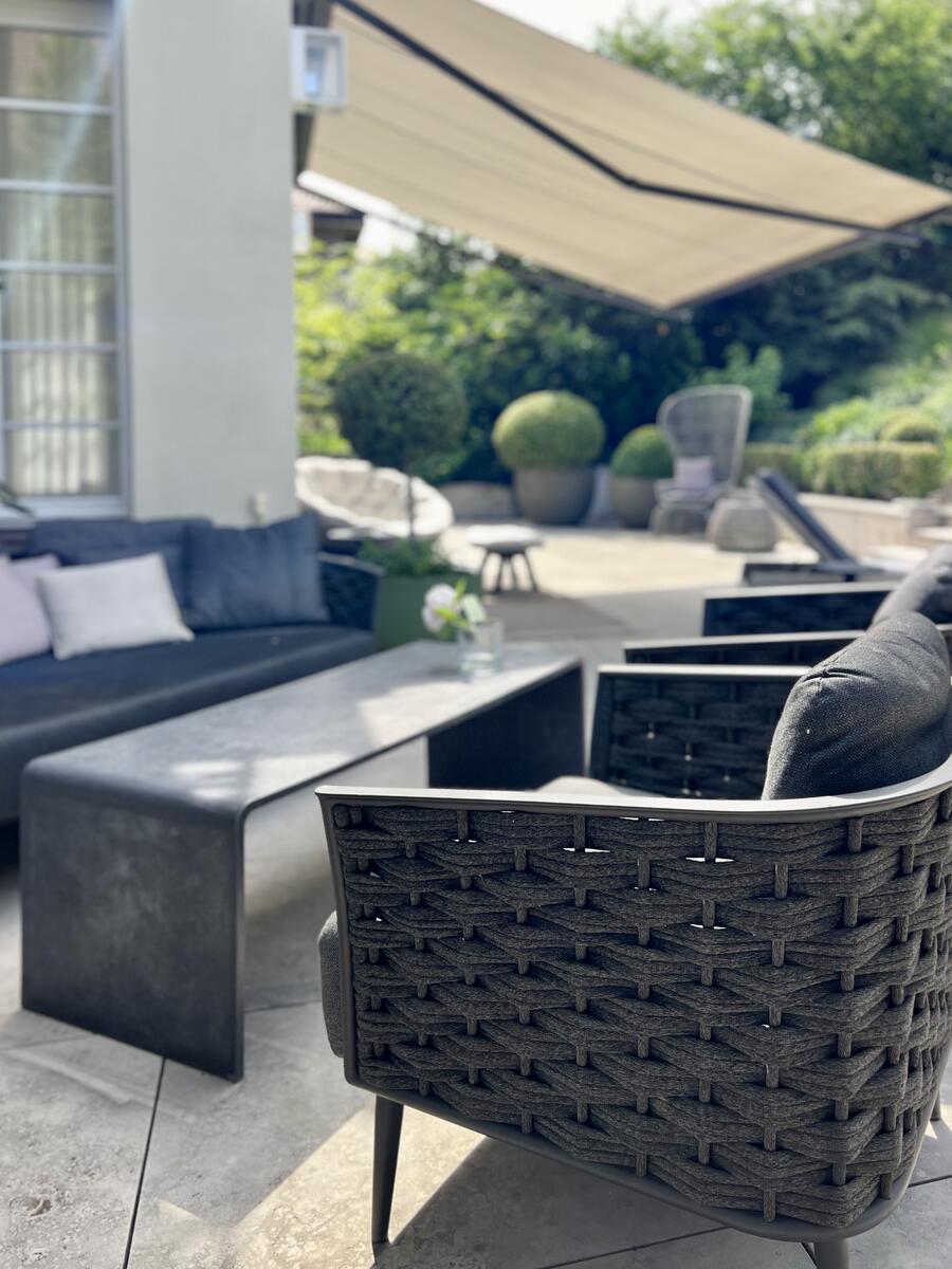 Kombinace otevřené markýzy a modelu Markilux 1710 spolu s venkovním nábytkem Manutti vytváří funkční terasu s efektivním stíněním a celoroční využitelností.