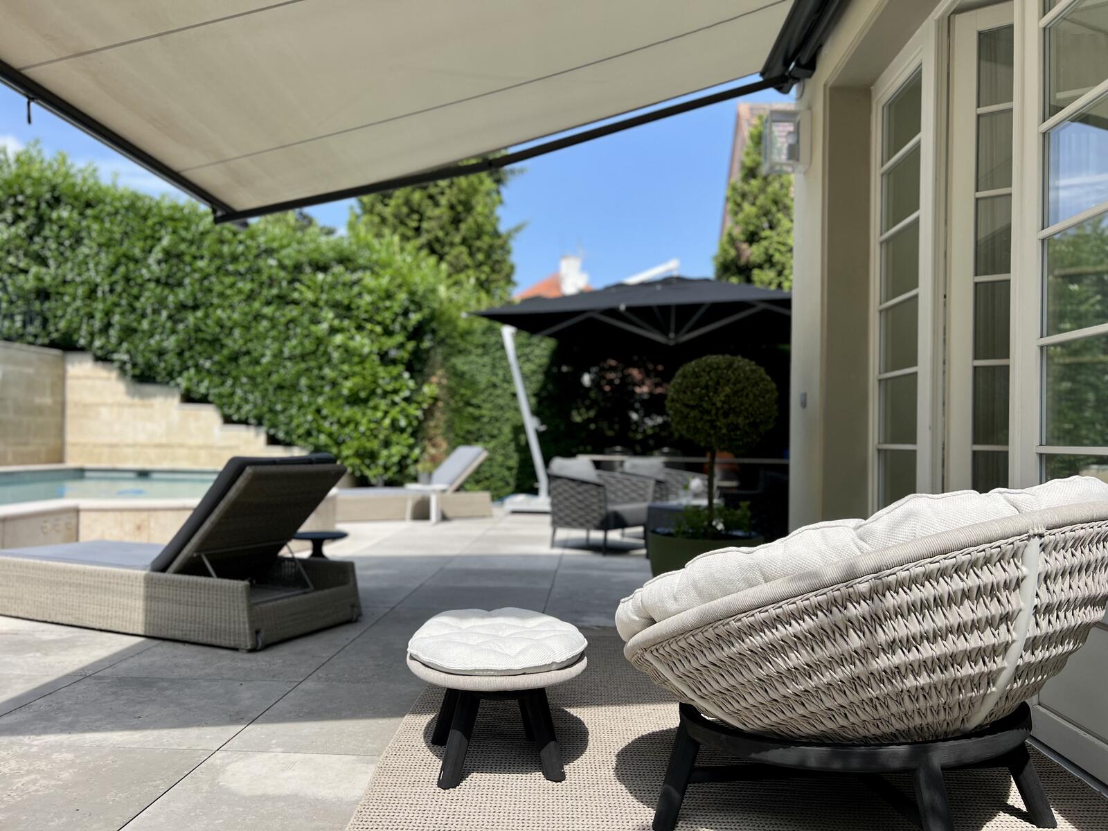 V části u bazénu je umístěn venkovní nábytek značky Manutti s odolným výpletem a konstrukcí navrženou pro exteriér. Použité materiály odolávají UV záření, vlhkosti i teplotním výkyvům, což umožňuje dlouhodobé využití bez náročné údržby.