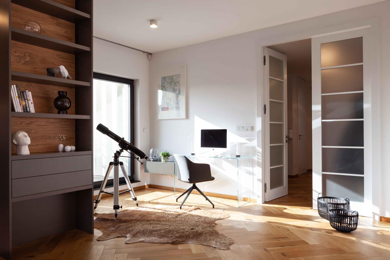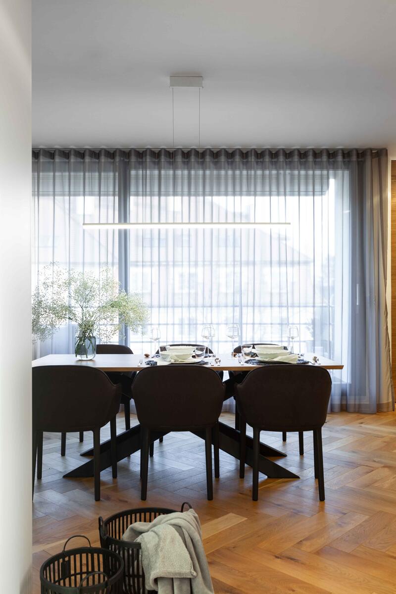 V interiéru byly použity produkty značky SITS a italské značky Sovet, které spojují nadčasový design a kvalitní zpracování. Jemné záclony a plissé stínění zajišťují soukromí i příjemné denní světlo, zatímco venkovní rolety přinášejí dokonalou regulaci světla a tepla.