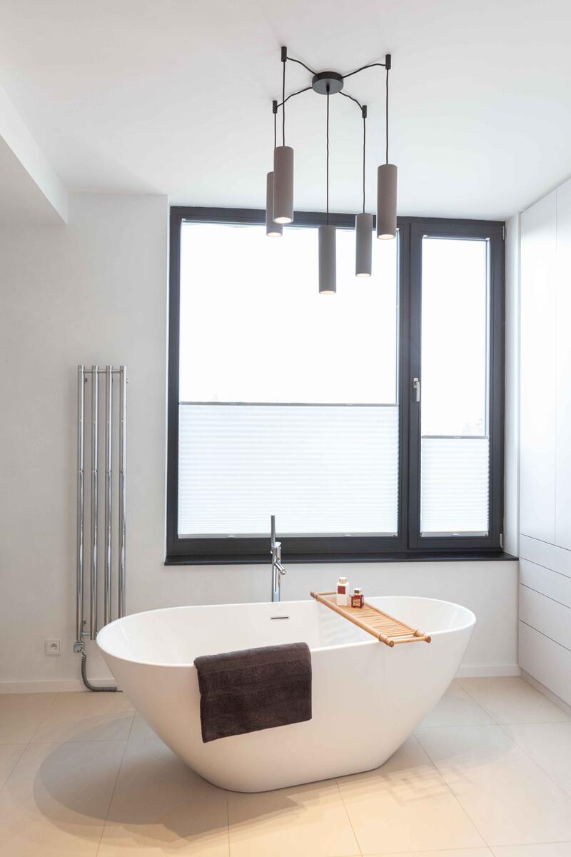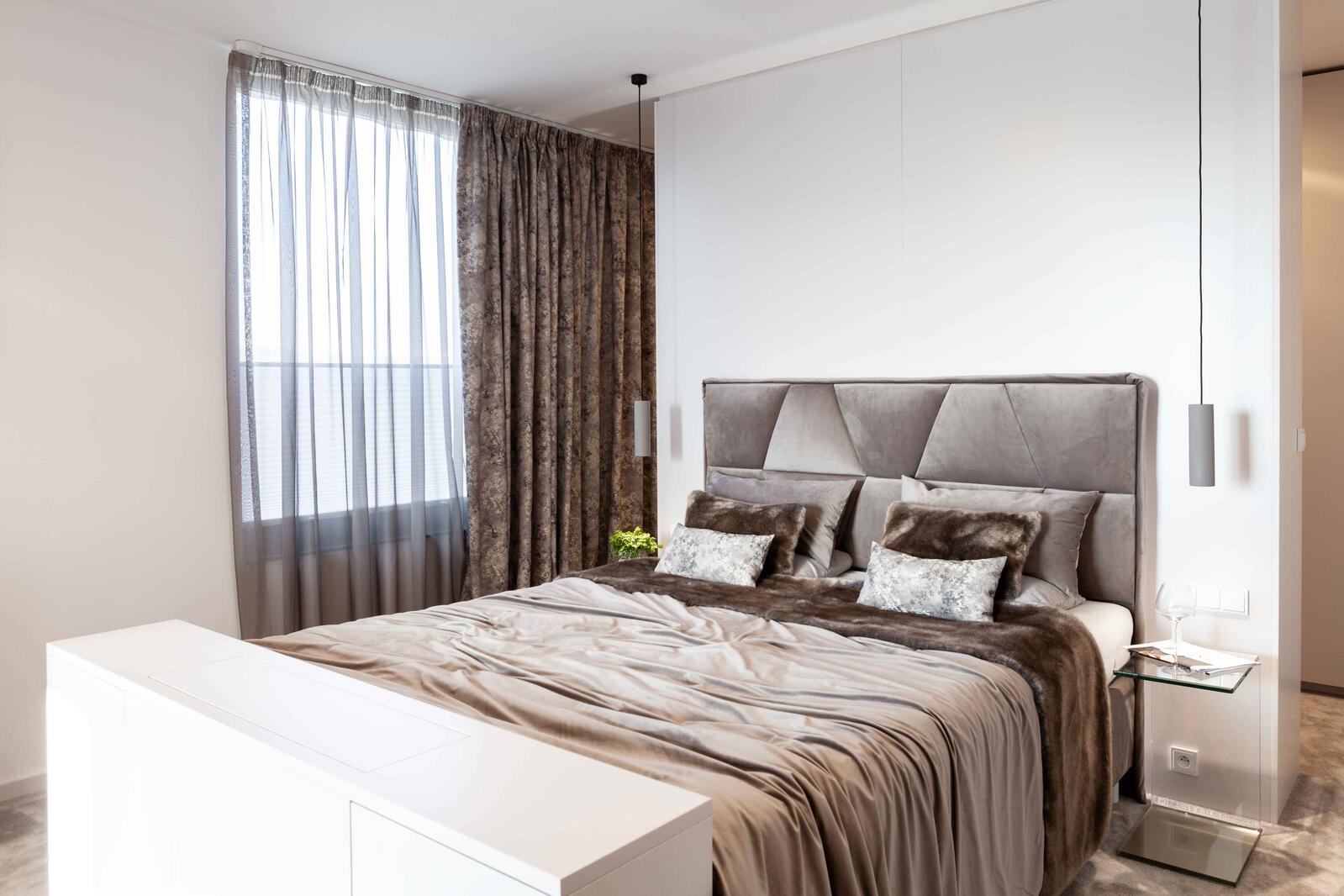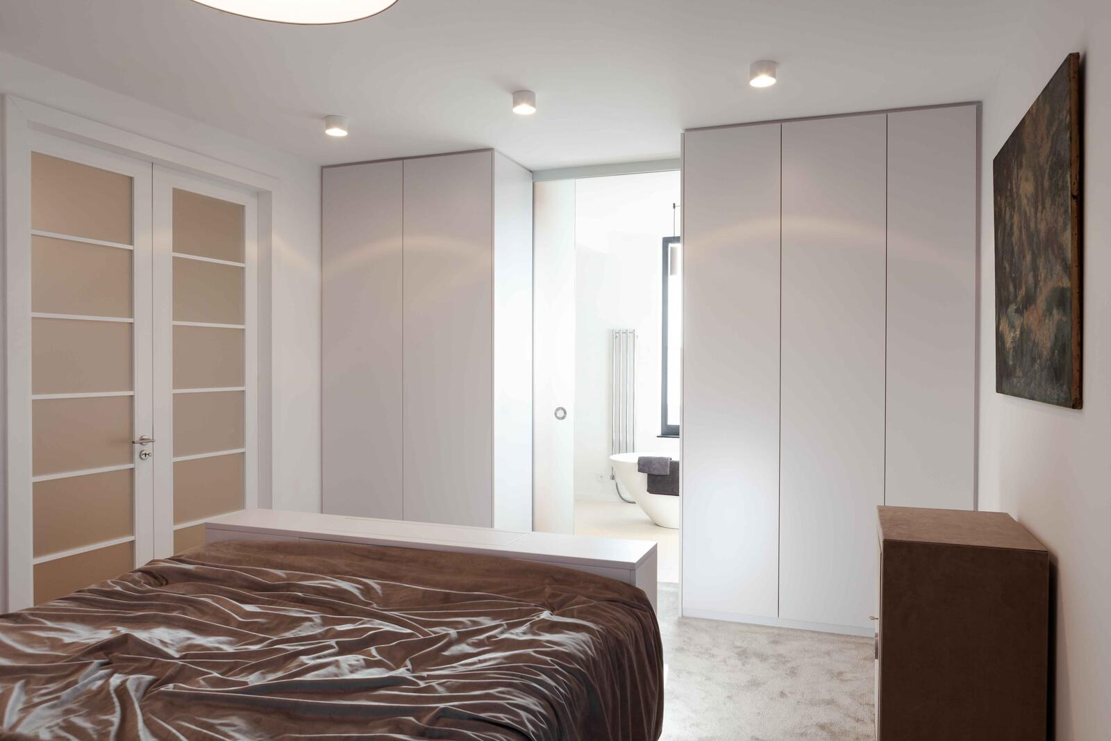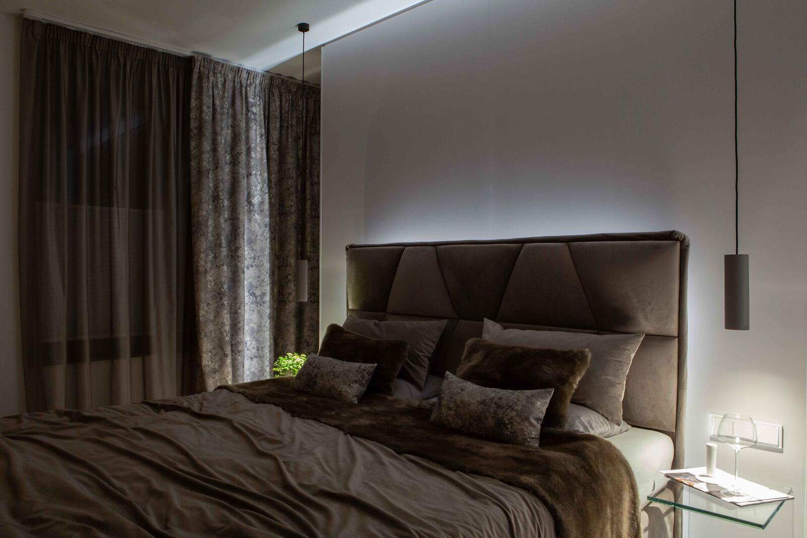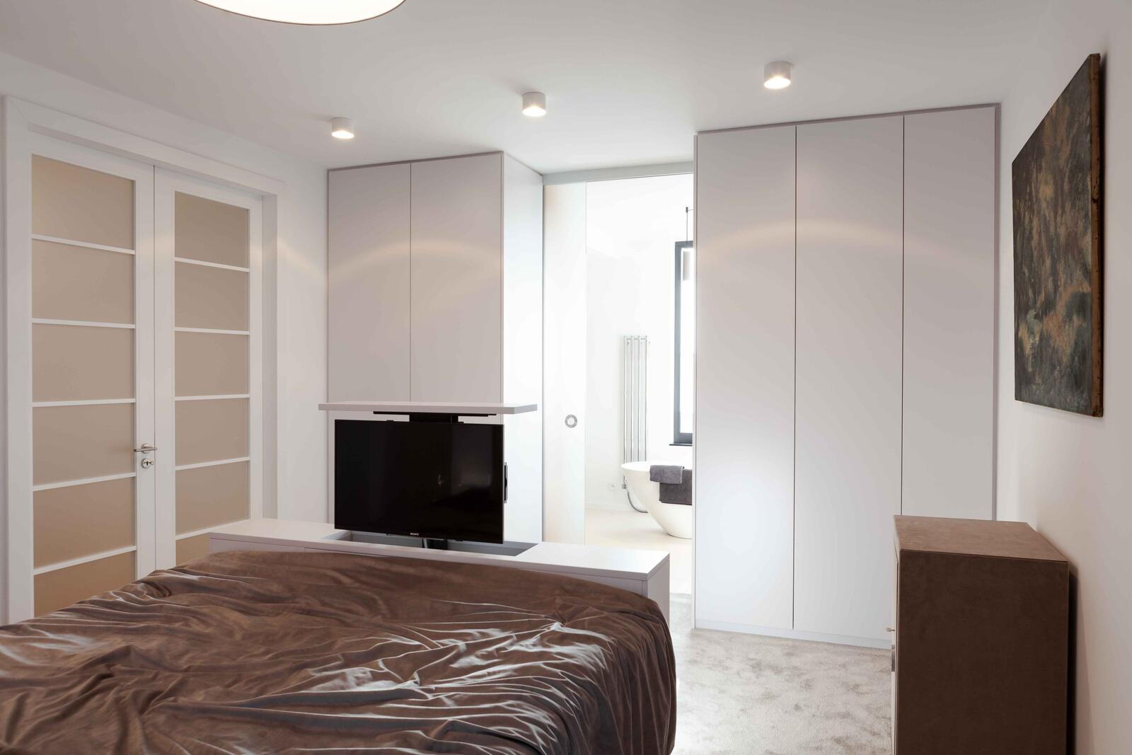V hlavní ložnici byl použit na míru vyrobený výsuvný TV lift, který umožňuje elegantně skrýt televizi do nožního čela postele. Praktické řešení, které zachovává čistotu prostoru a zároveň nabízí maximální komfort.