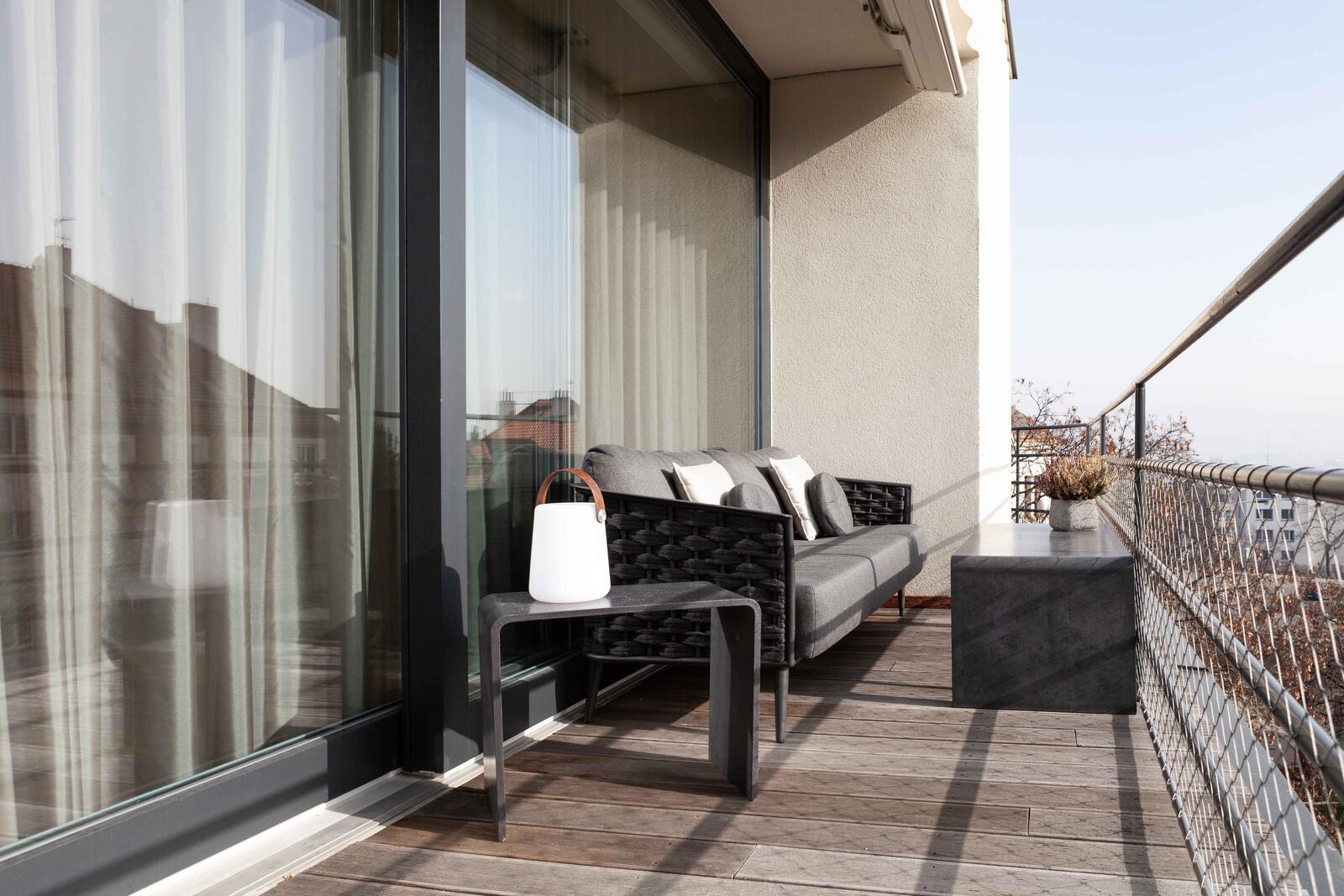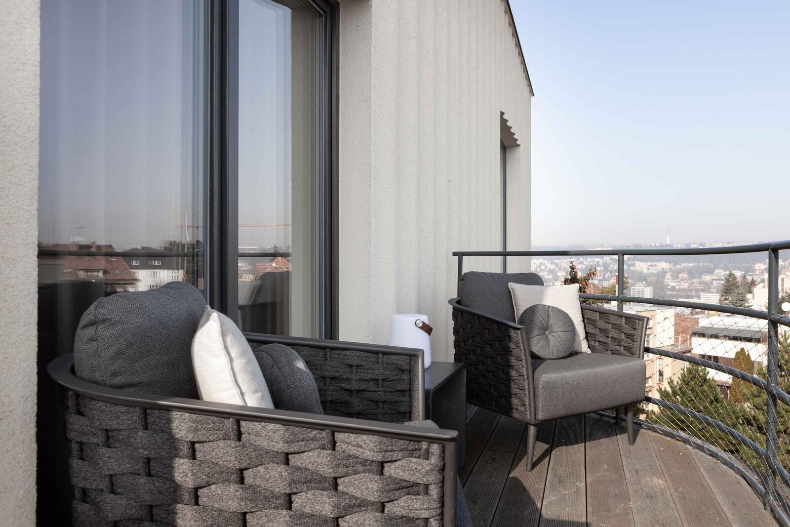 Na terasách byl zvolen venkovní nábytek Manutti, který díky kombinaci hliníkové konstrukce a textilních výpletů perfektně odolává povětrnostním vlivům a v kontrastu s teplým dřevěným povrchem terasy vytváří elegantní a klidné zázemí pro odpočinek.