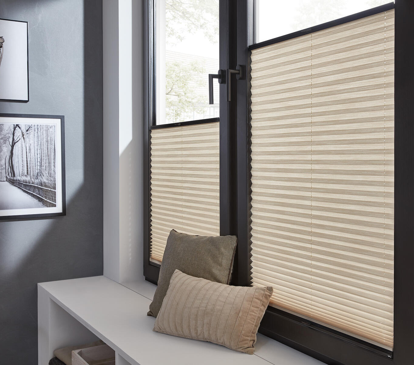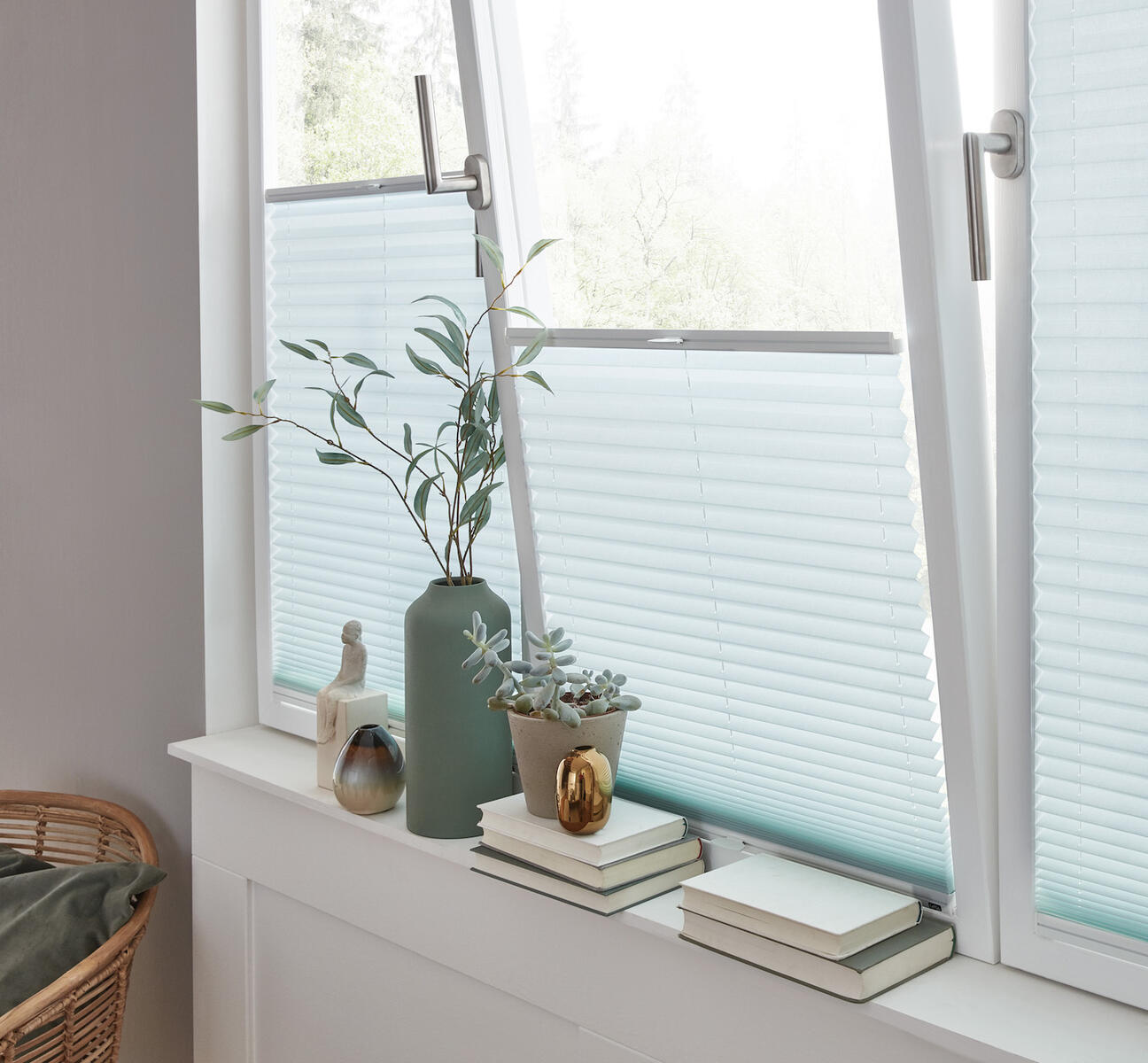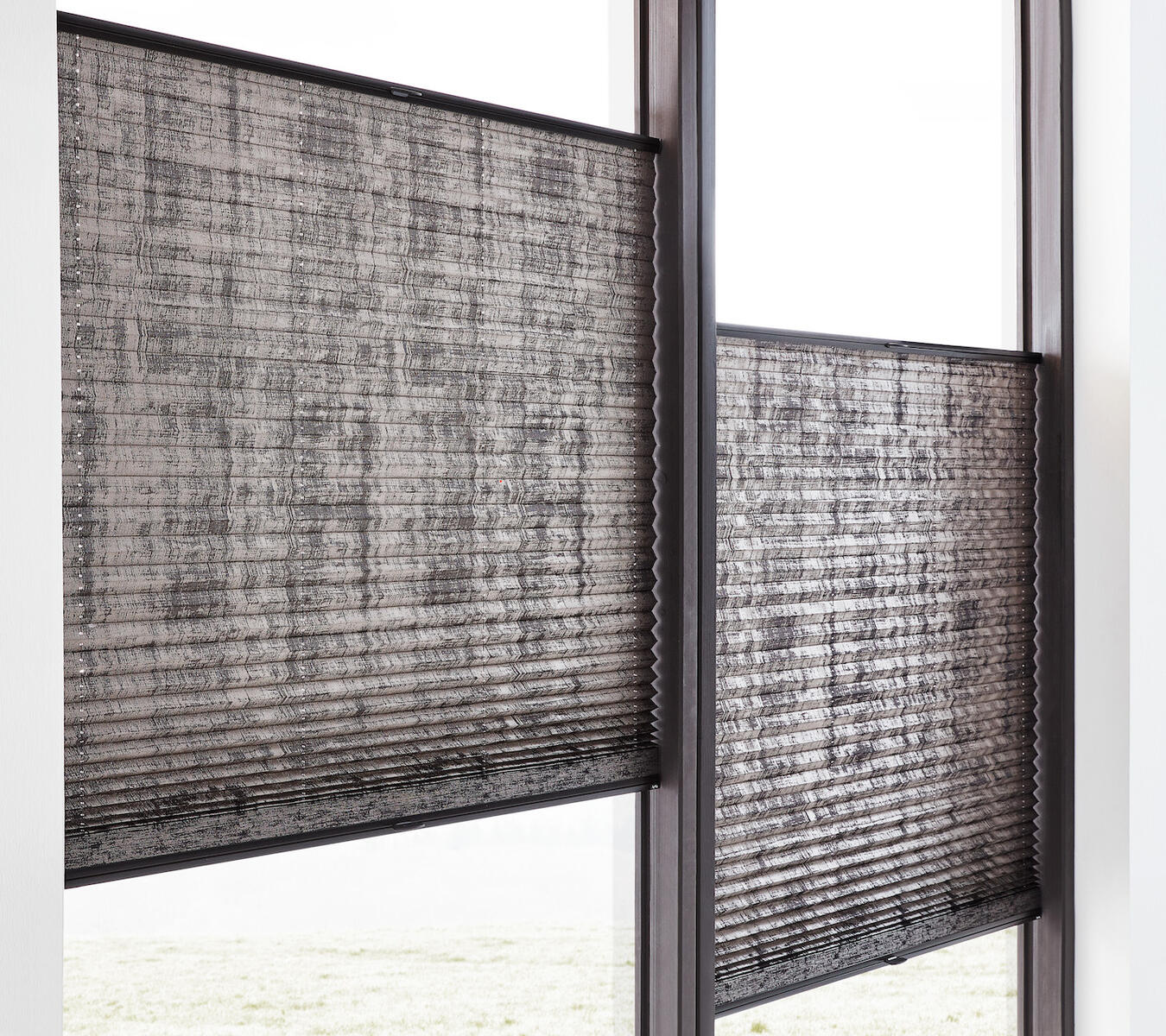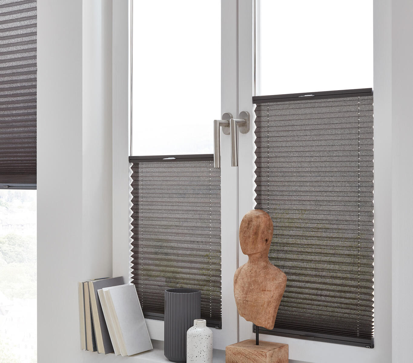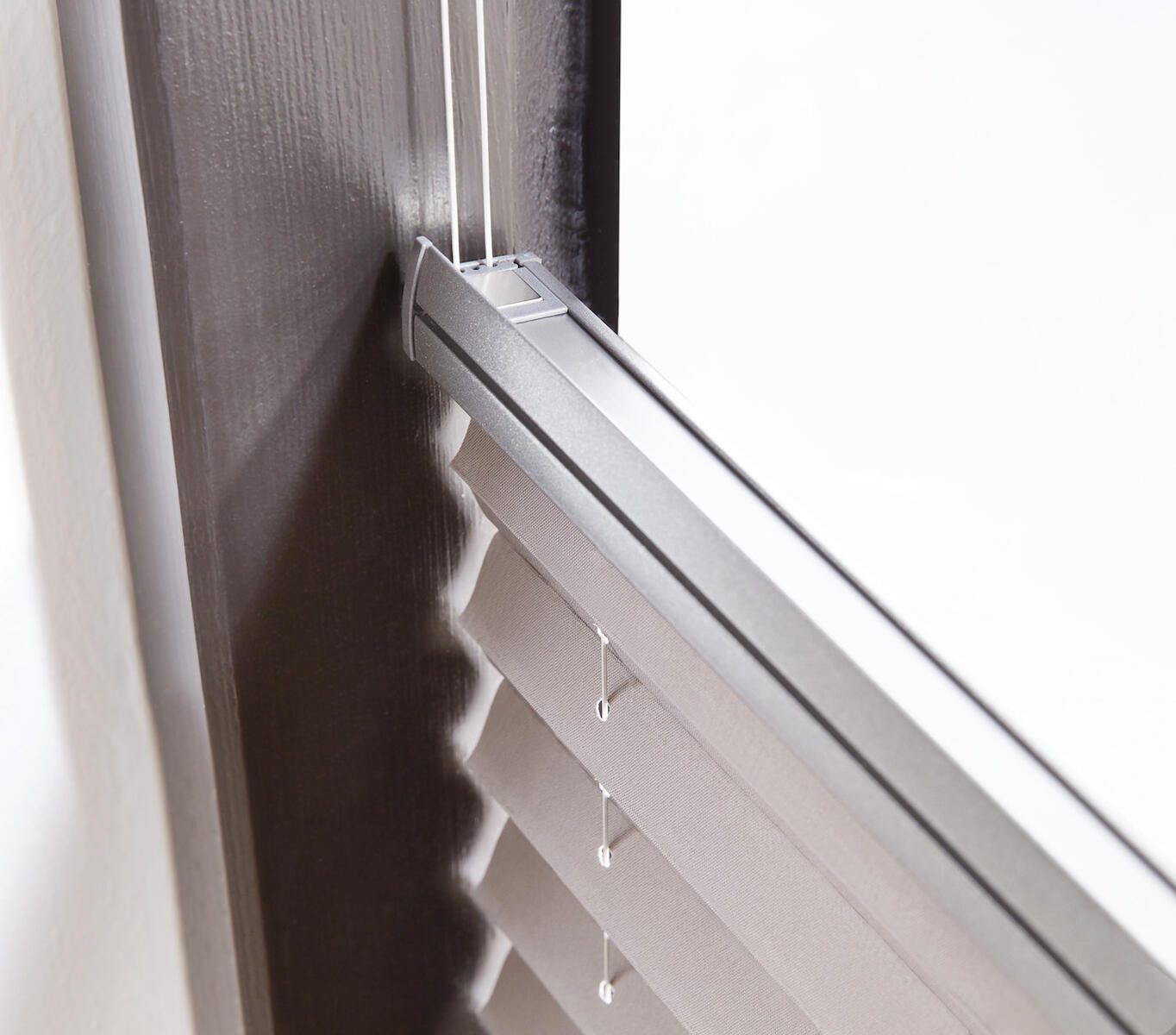 Plisovaná roleta z jednoduché látky, ideální pro montáž do zasklívací lišty.