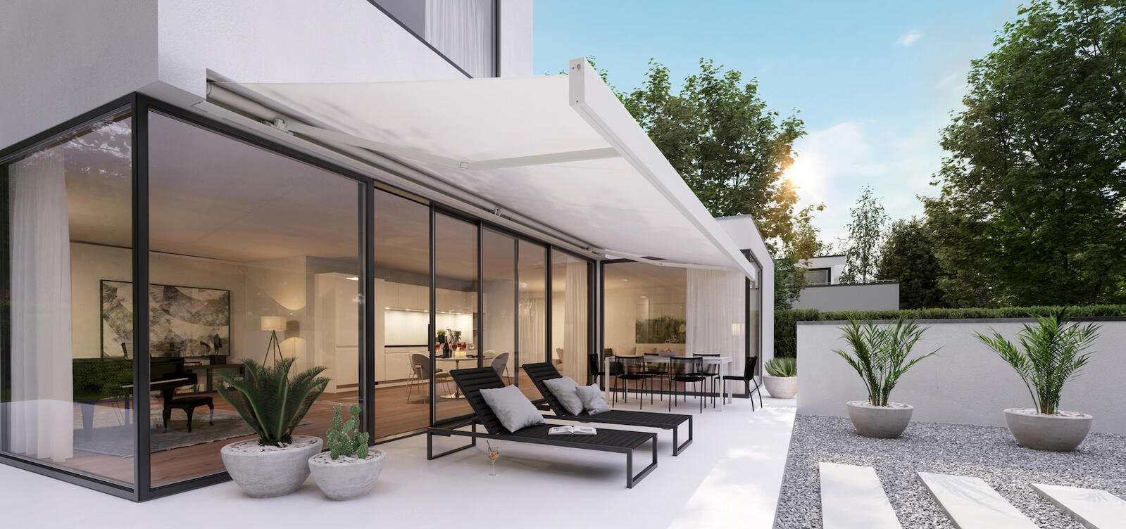 Čisté řešení bez kompromisů - kazetová markýza pro instalaci do kastlíku ve fasádě.