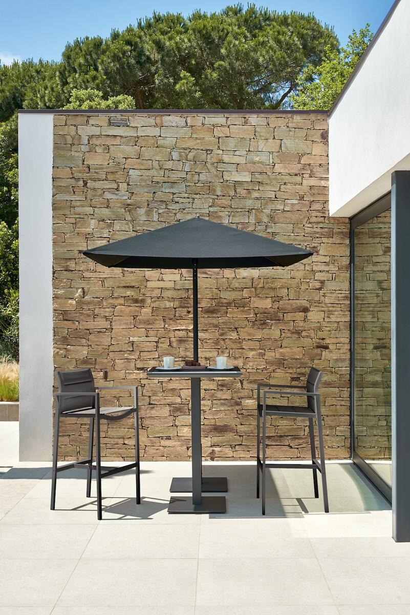 Barová židle s područkami vyniká pohodlím a flexibilitou, díky dvěma výškám pro různé venkovní prostory.