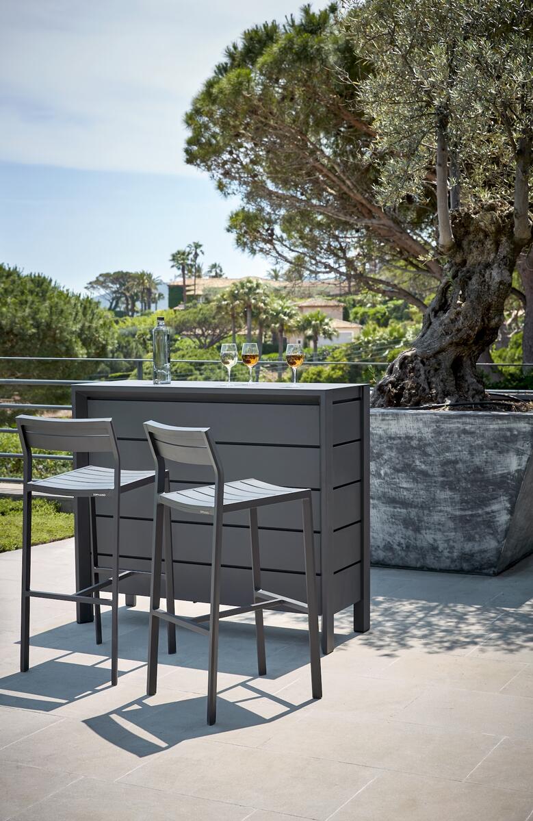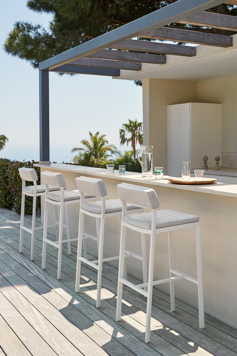 Elegantní venkovní barová židle s výškou sedáku 78 cm nebo 62 cm. Volitelné polstrování.