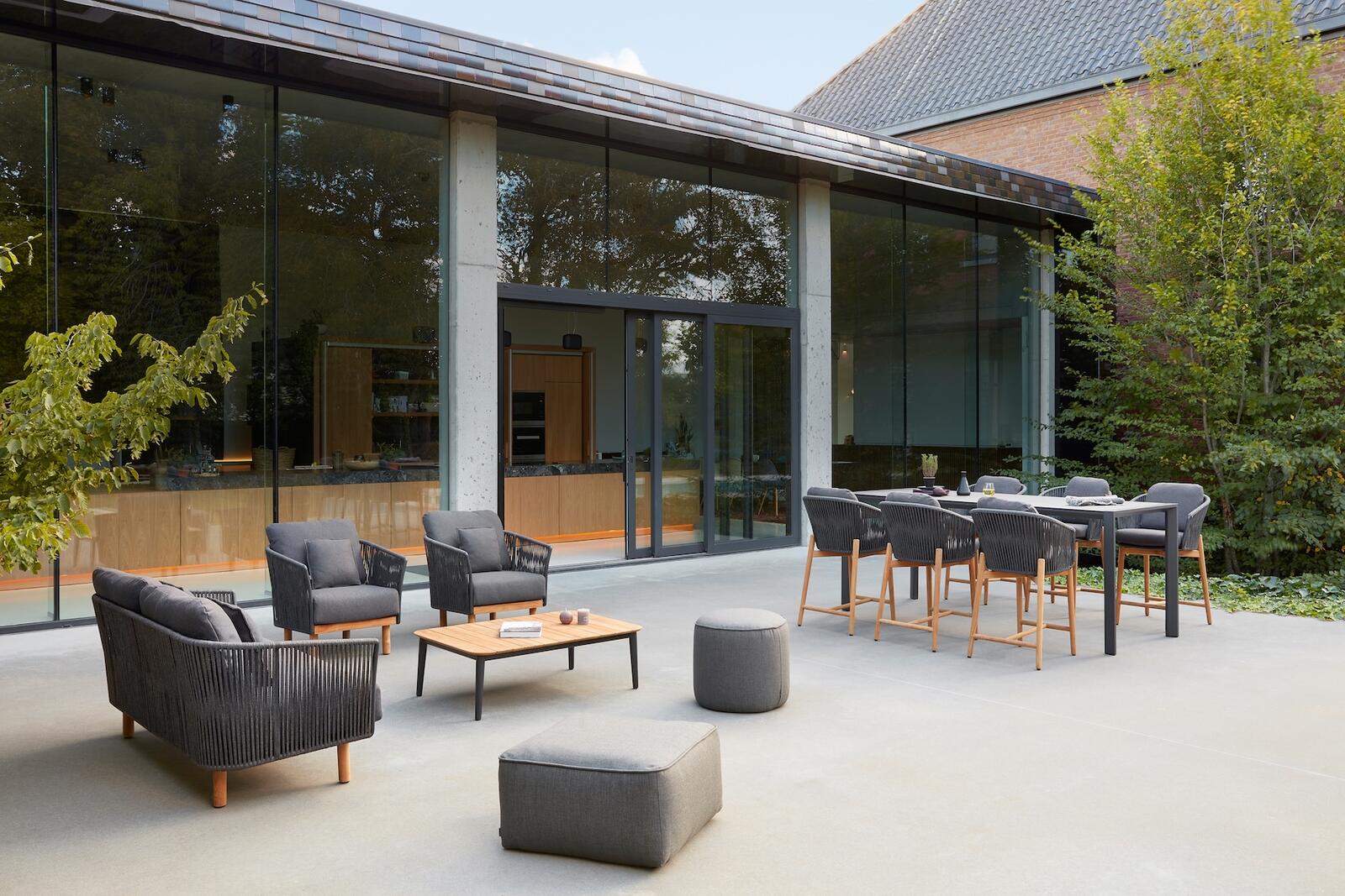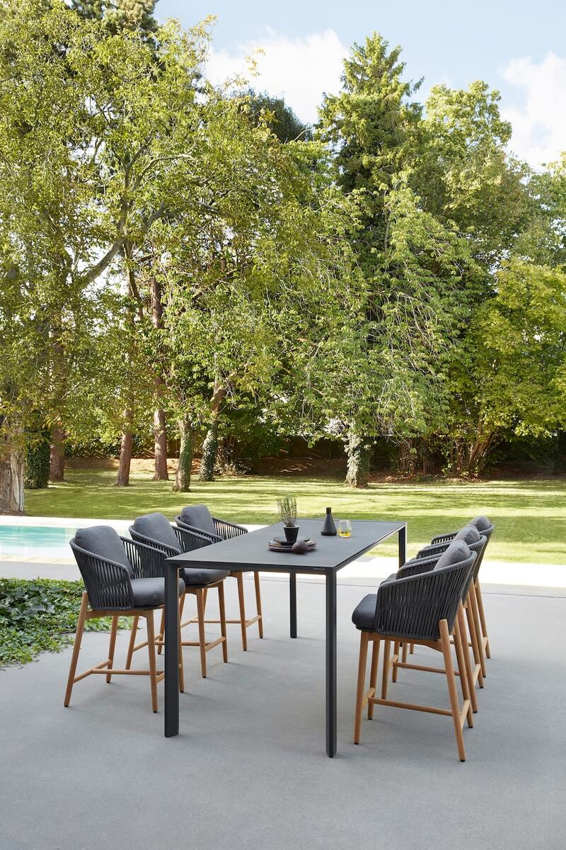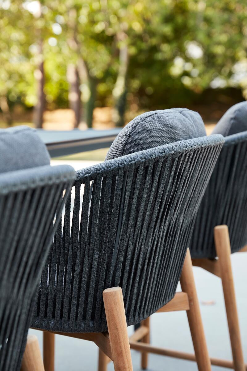 Stylová venkovní barová židle s teakovou podnoží a odolným textilním výpletem.