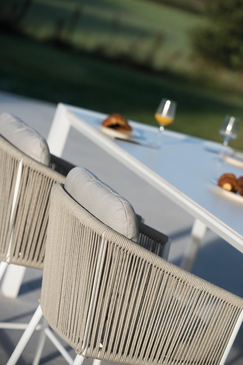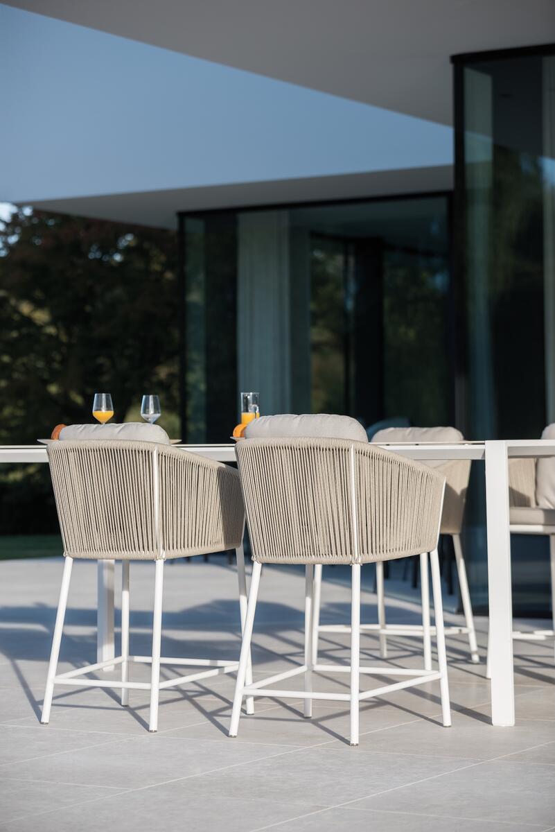 Venkovní barové židle Omer nabízejí moderní design, pohodlí a odolnost pro venkovní i interiérové prostory. Lehký, ale pevný hliníkový rám doplňuje výplet z kvalitního lana, který přináší nejen atraktivní vzhled, ale i dlouhou životnost. Pohodlný sedák a polštář pro opření zad zvyšuje pocit komfortu.