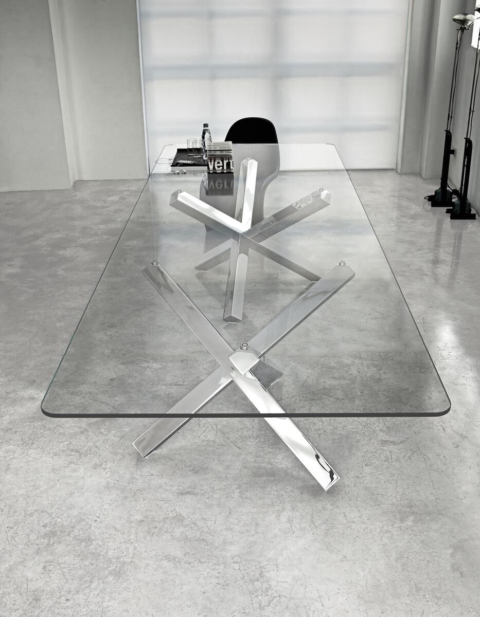Jídelní stůl s atypickou zkříženou podnoží.