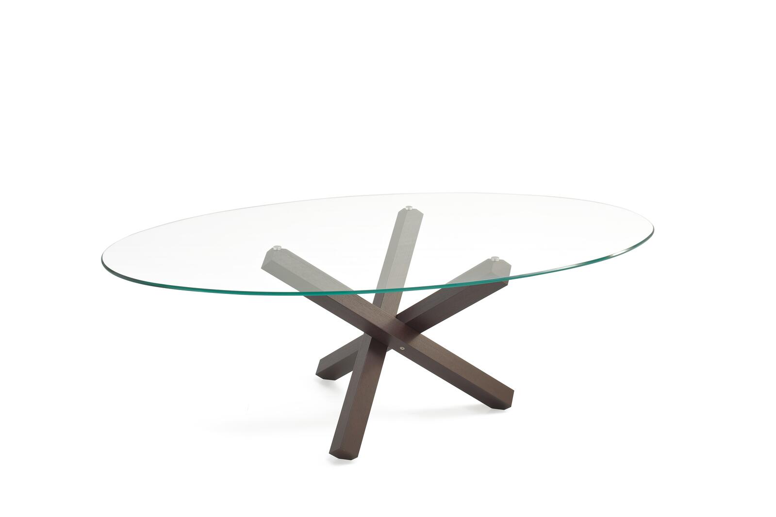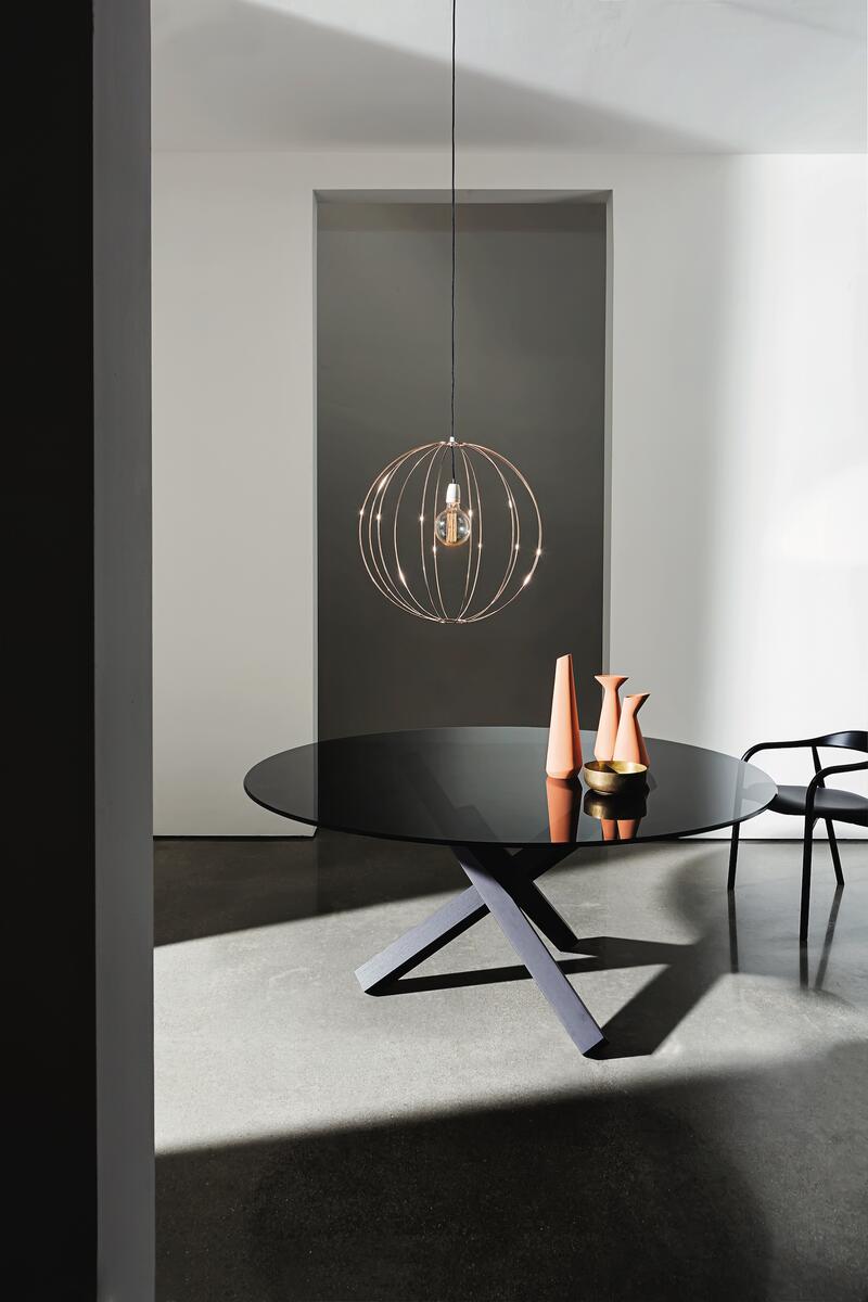Moderní jídelní stůl Aikido nabízí dřevěnou nebo kovovou variantu atypické zkřížené podnože. Deska jídelního stolu může být kulatá, oválná, čtvercová nebo obdélníková.