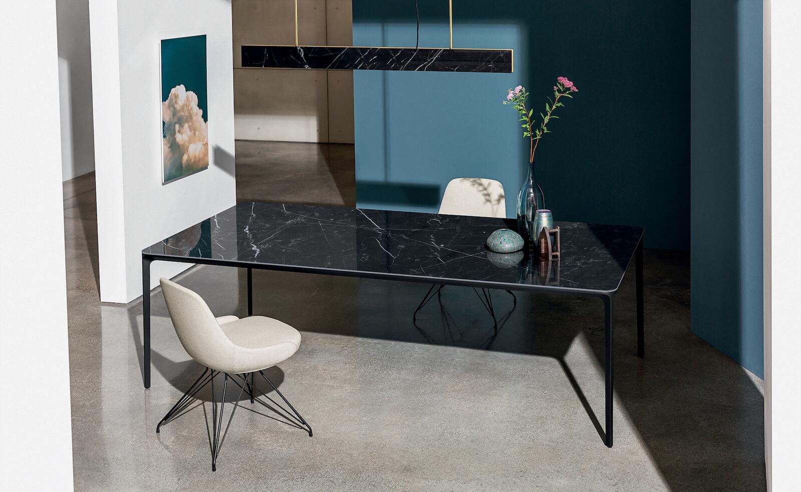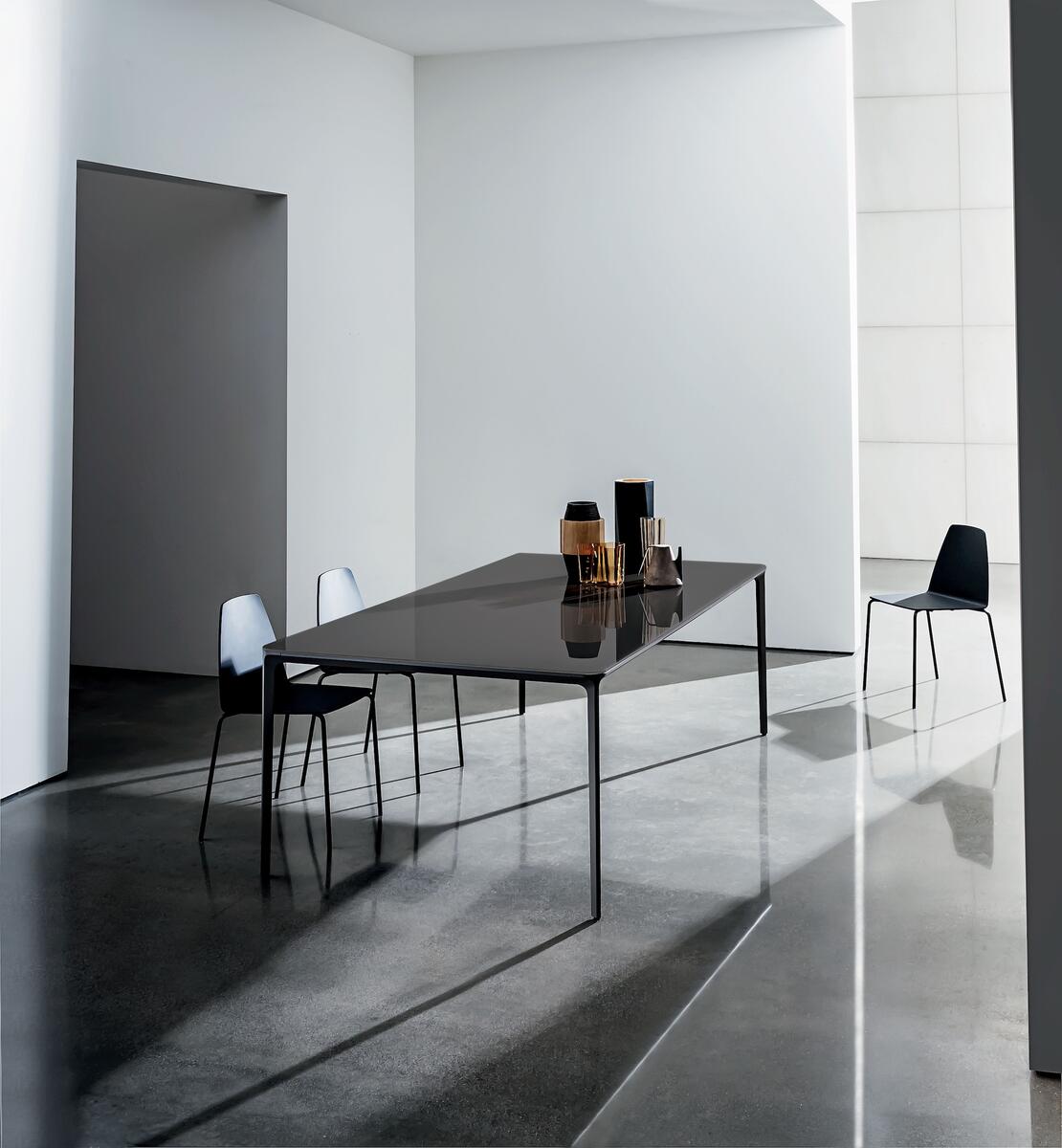 Moderní jídelní stůl s minimalistickým designem a rozkládací variantou.
