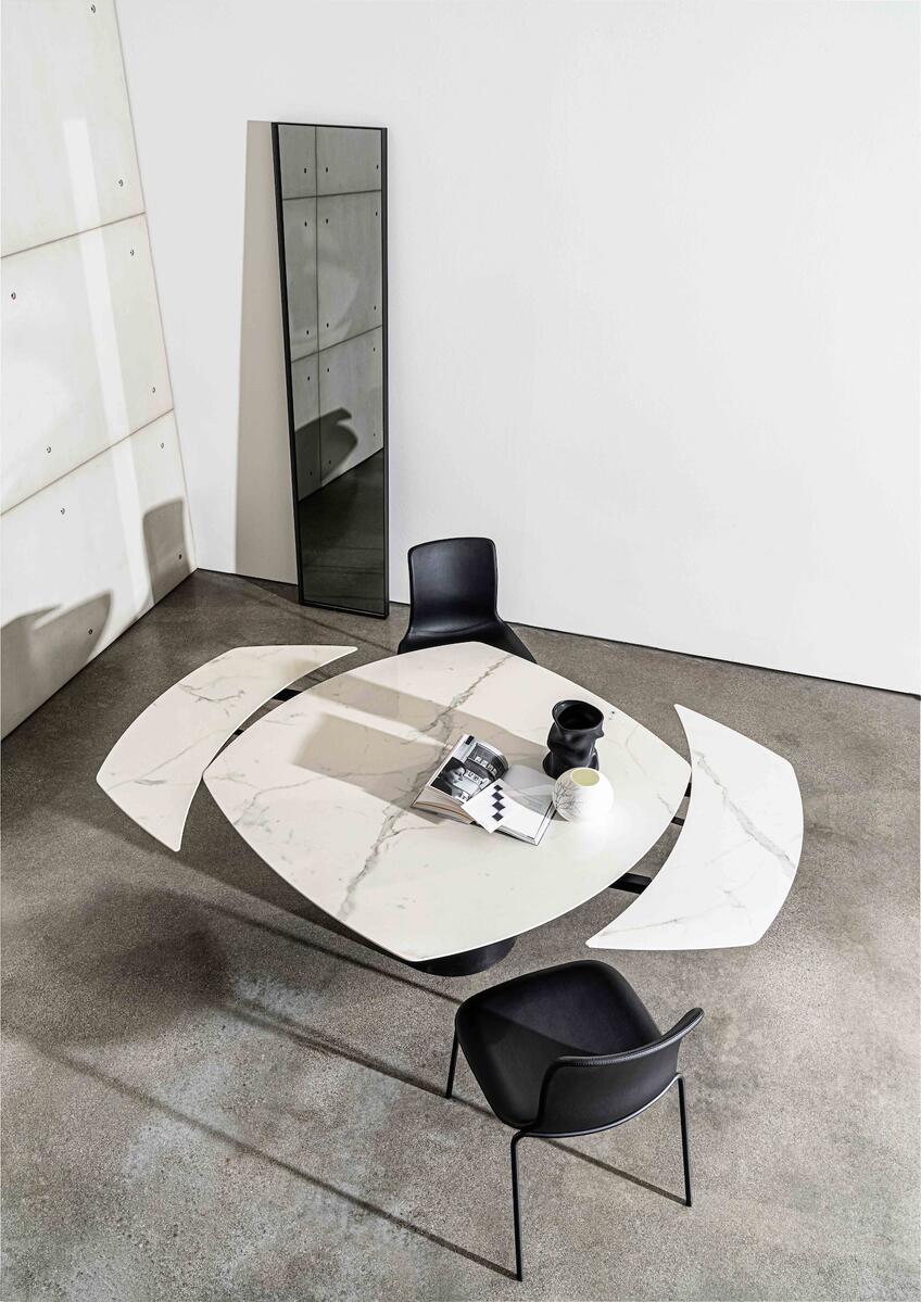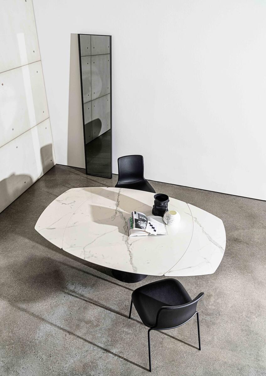 Ikonický a nadčasový tvar jídelního stolu se středovou podnoží – také v rozkládací variantě.