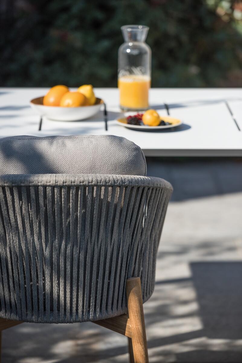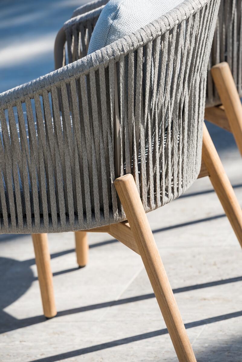 Jídelní židle s područkami pro maximální komfort. Kvalitní teaková podnož a odolný textilní výplet.