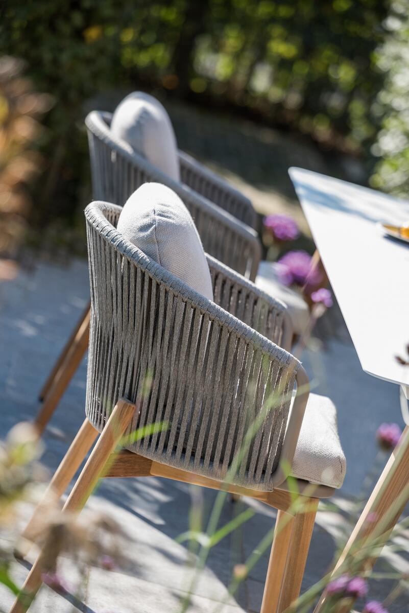 Venkovní jídelní židle Newport s područkami spojuje moderní design a kvalitní materiály. Lehký, ale pevný hliníkový rám doplněný podnoží z teakového dřeva, která dodává přírodní eleganci a vysokou odolnost. Sedák z textilního výpletu v kombinaci s polštáři poskytuje komfort a je navržen tak, aby odolal povětrnostním vlivům.